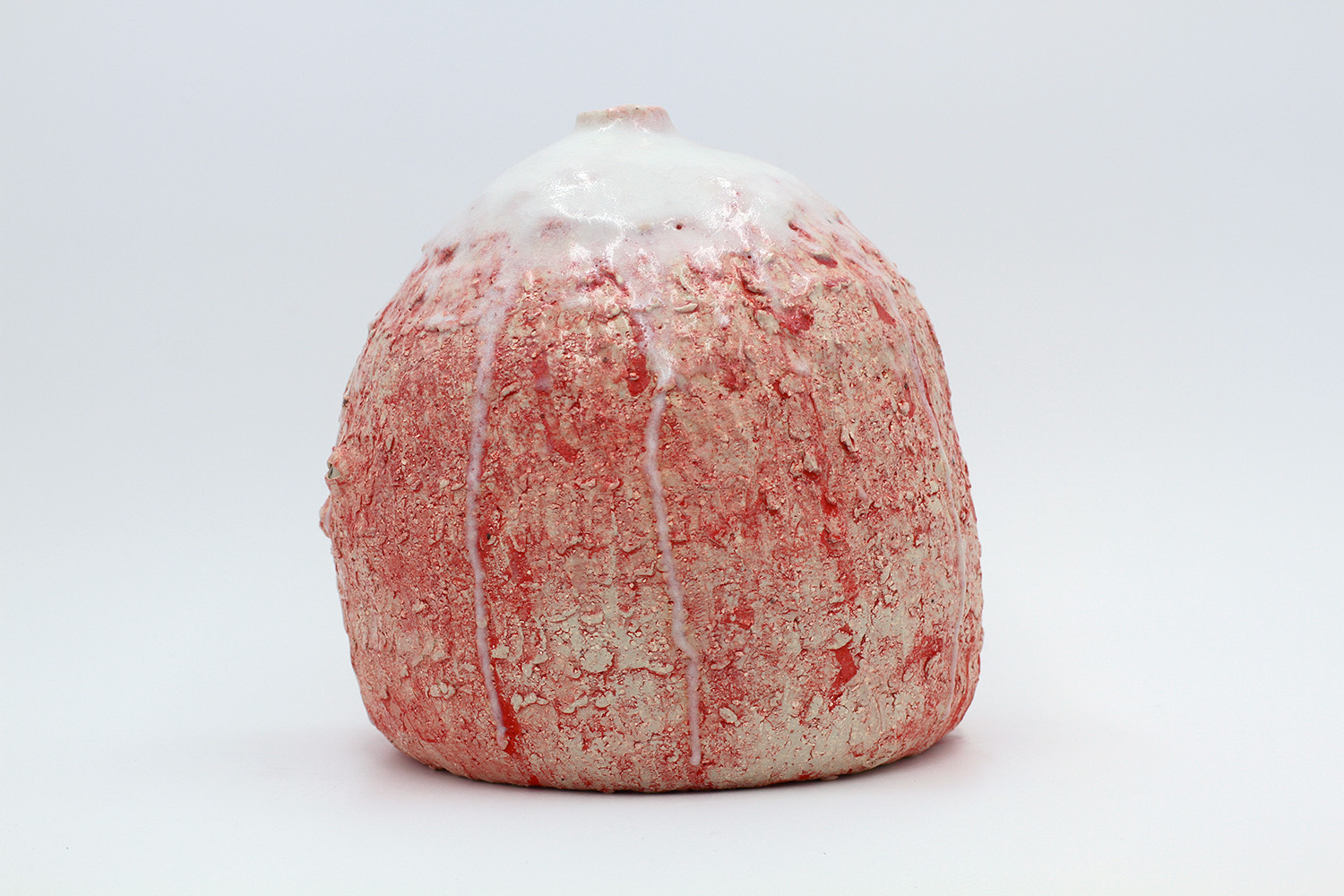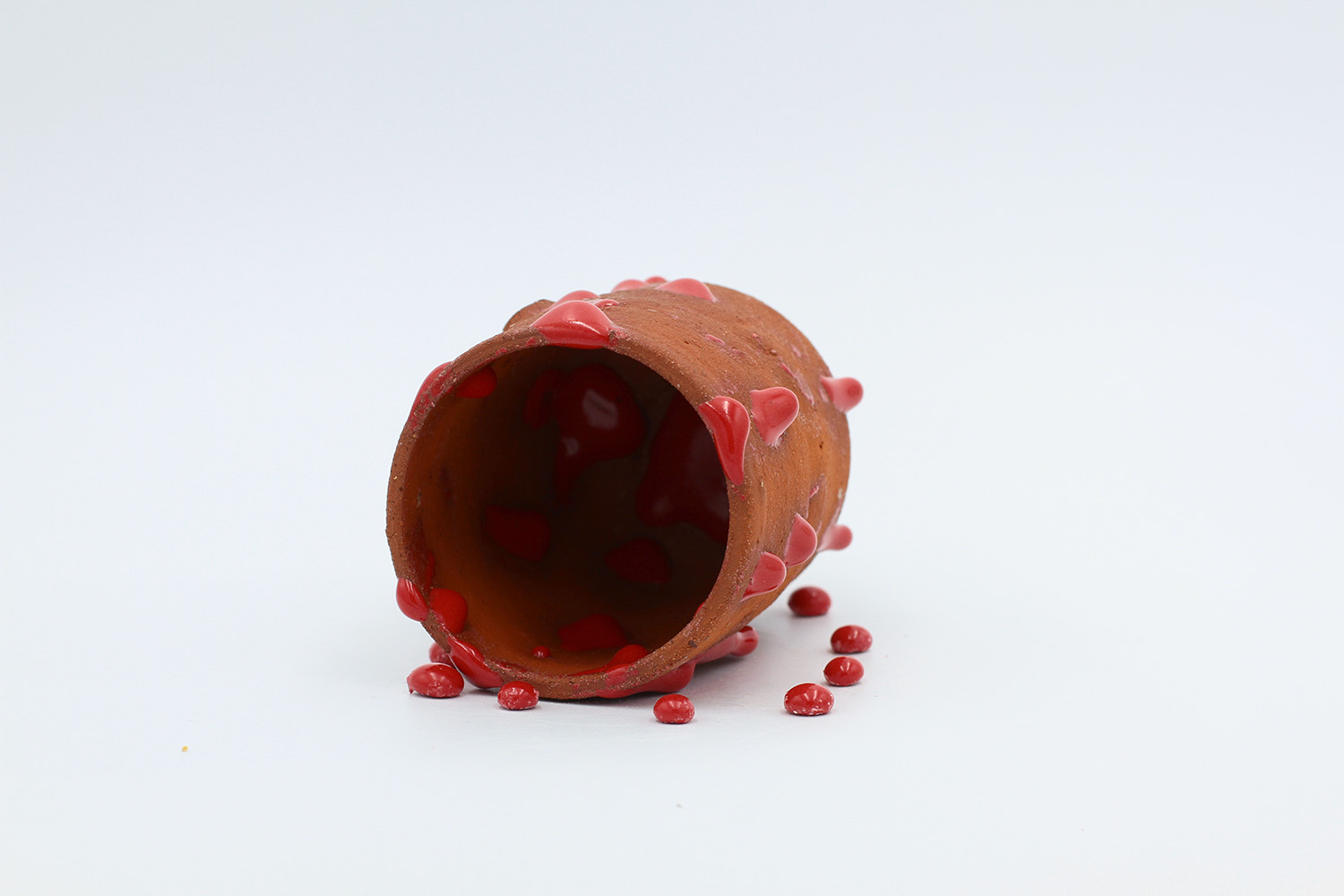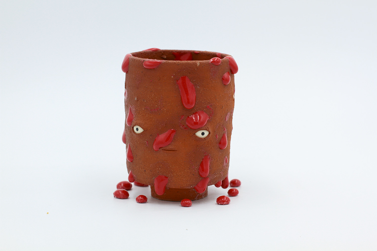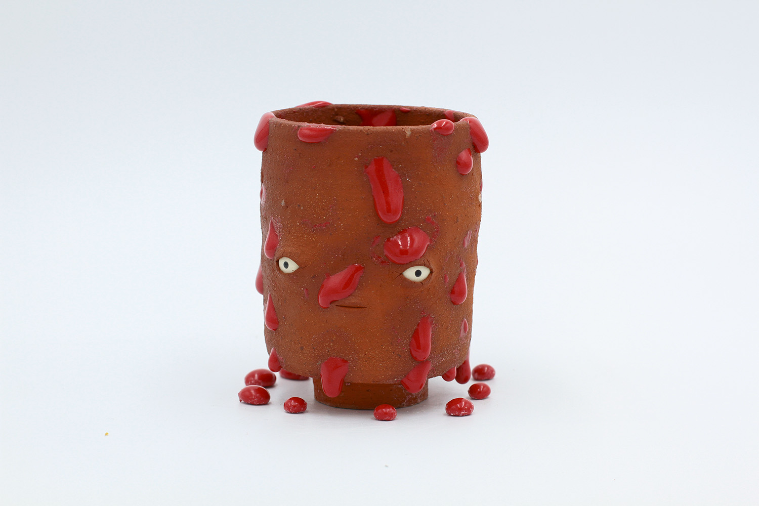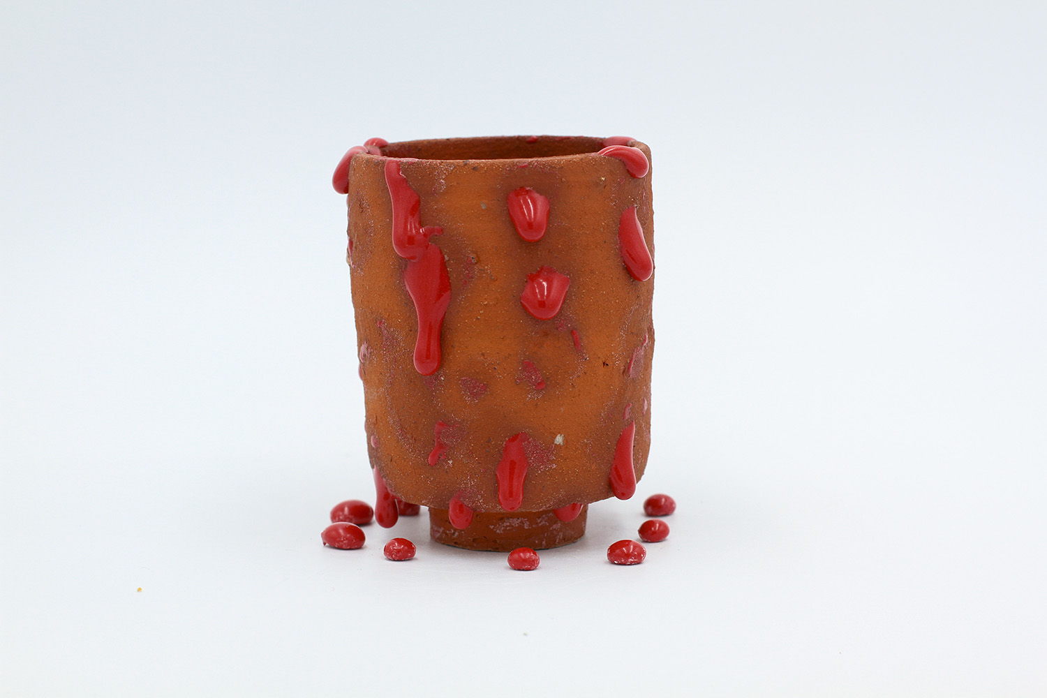 i am an ornamental vessel made from terracotta clay sourced from a building site in brunswick. my red gloopy glaze fell off in drips during firing. |