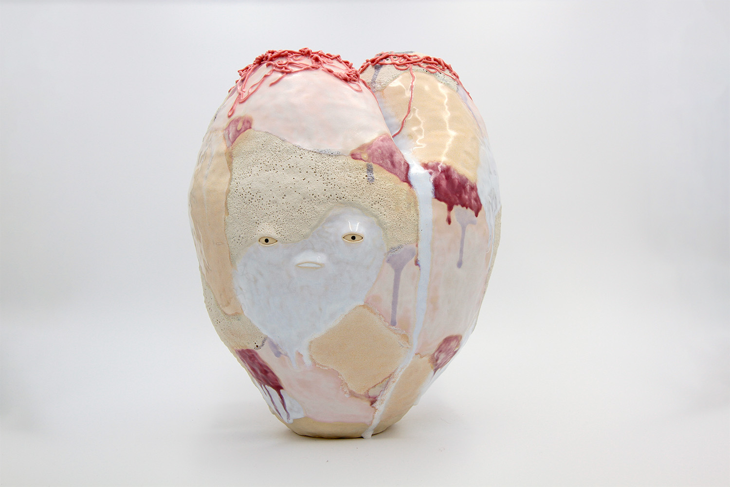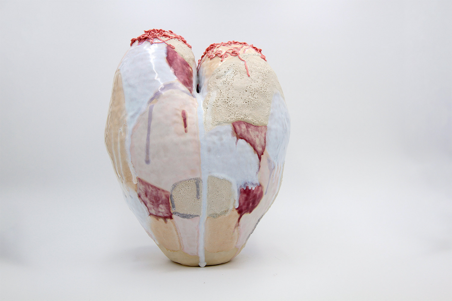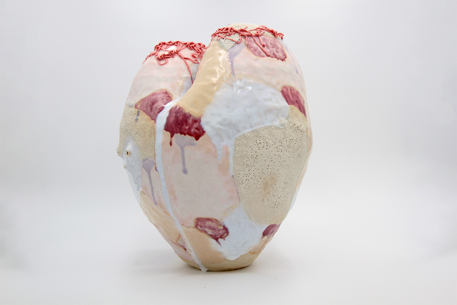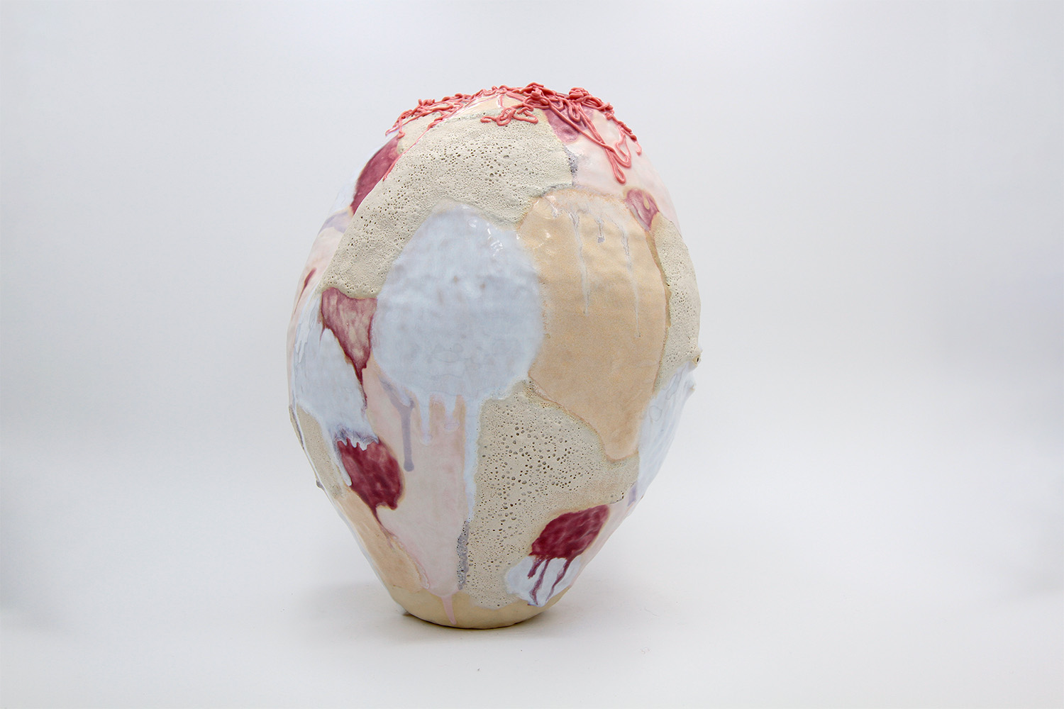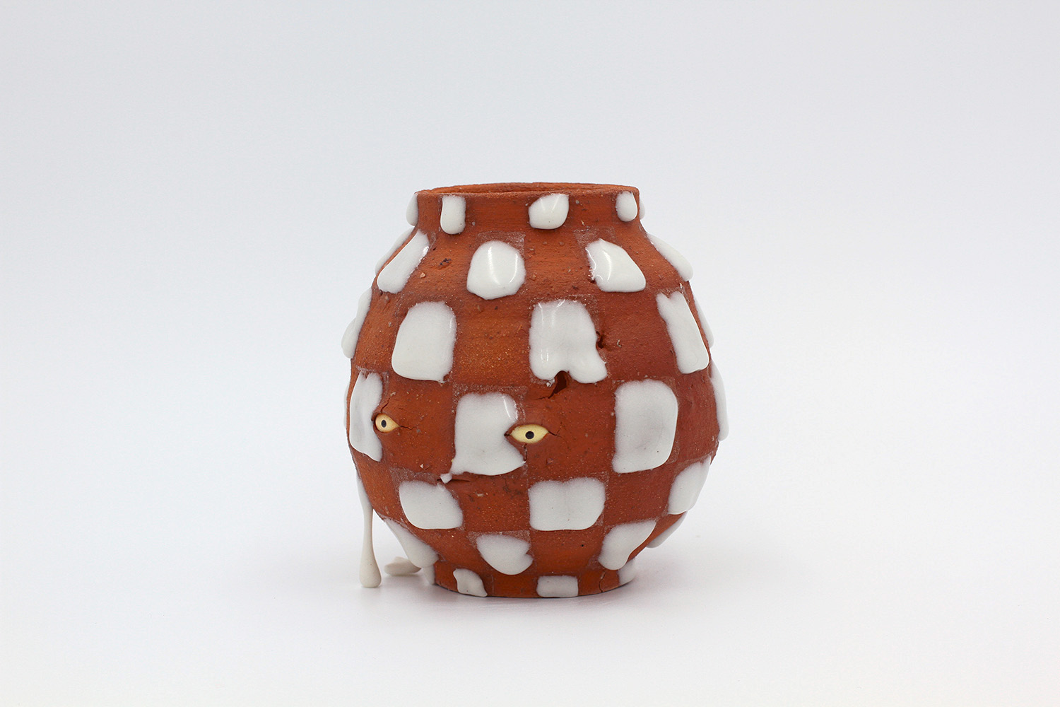 i am an ornamental vessel made from terracotta clay sourced from a building site in brunswick. my red gloopy glaze fell off in drips during firing. |