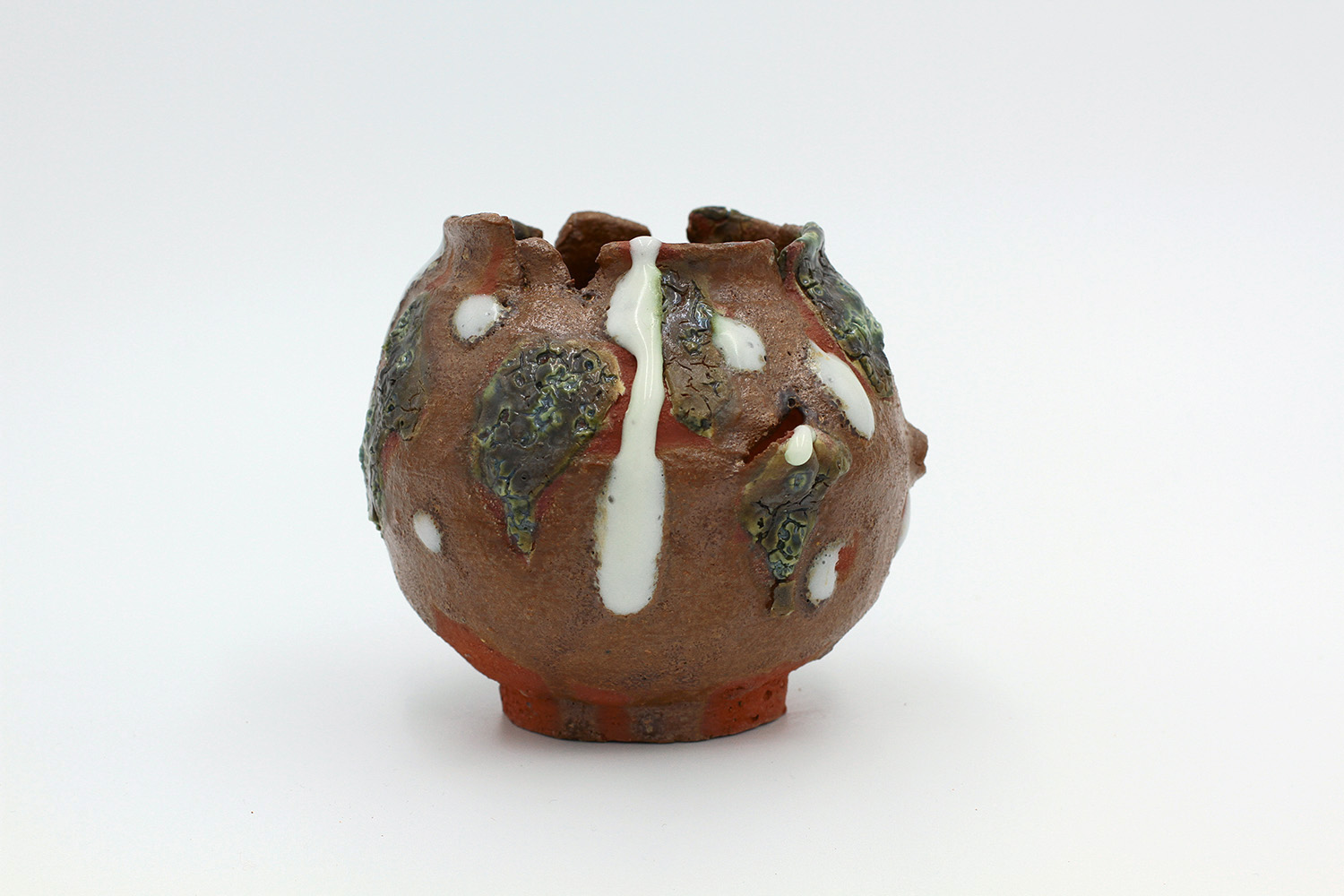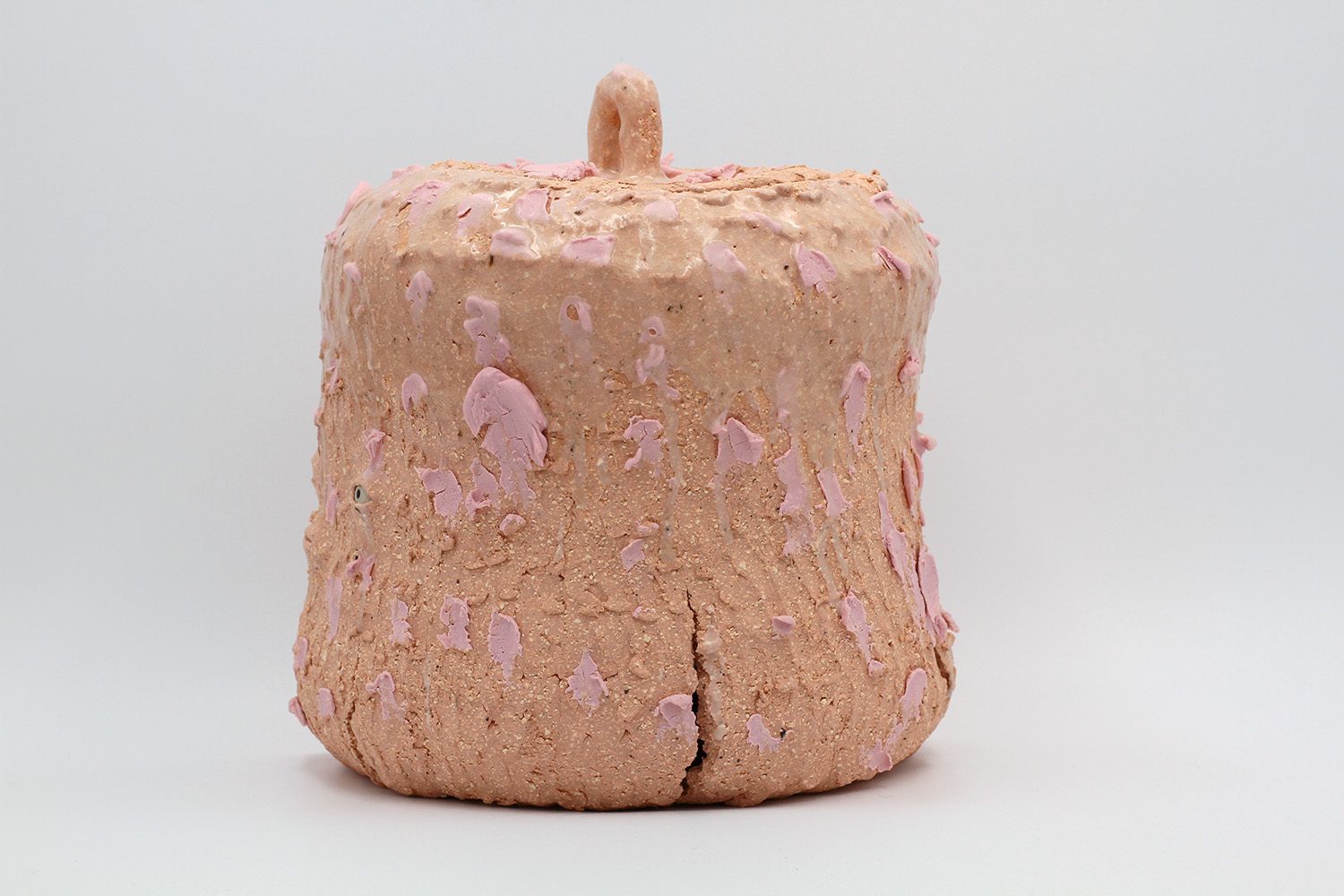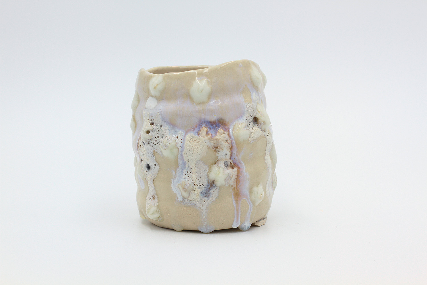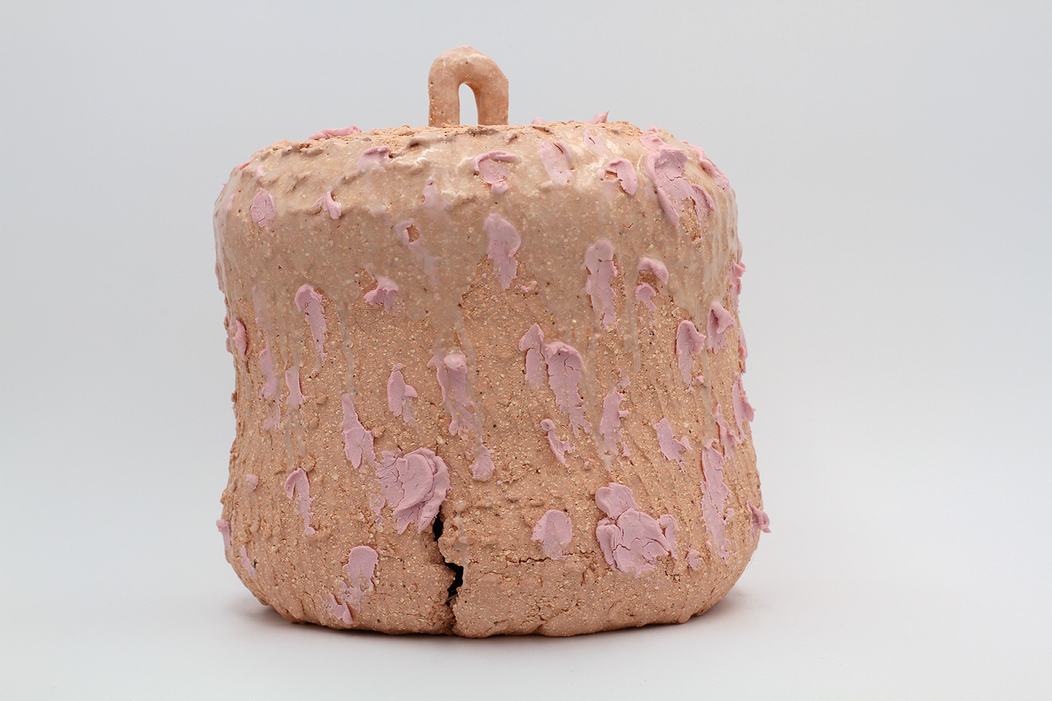 i'm a sculptural pot with bits of crackly lumpy glaze all over me. the cracks in me are intentional. |