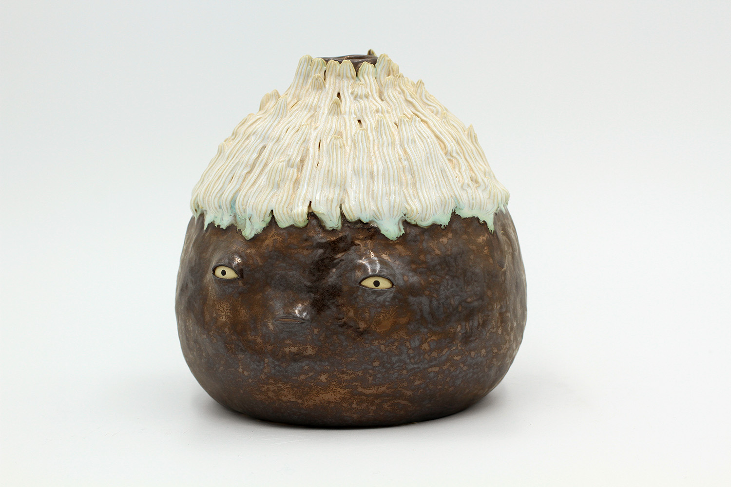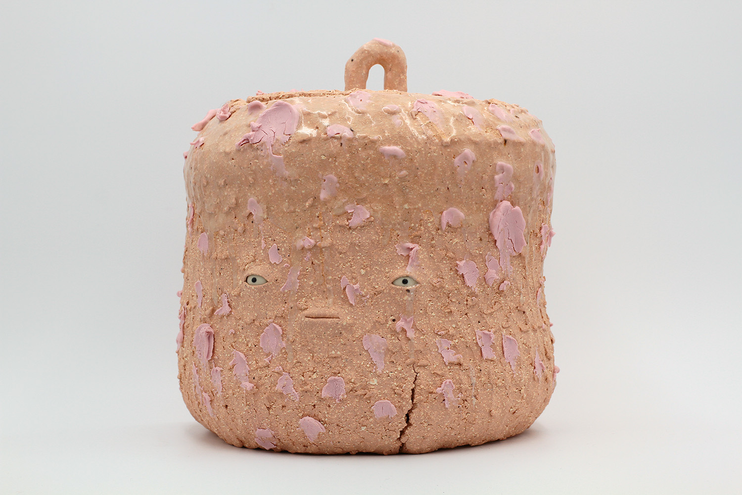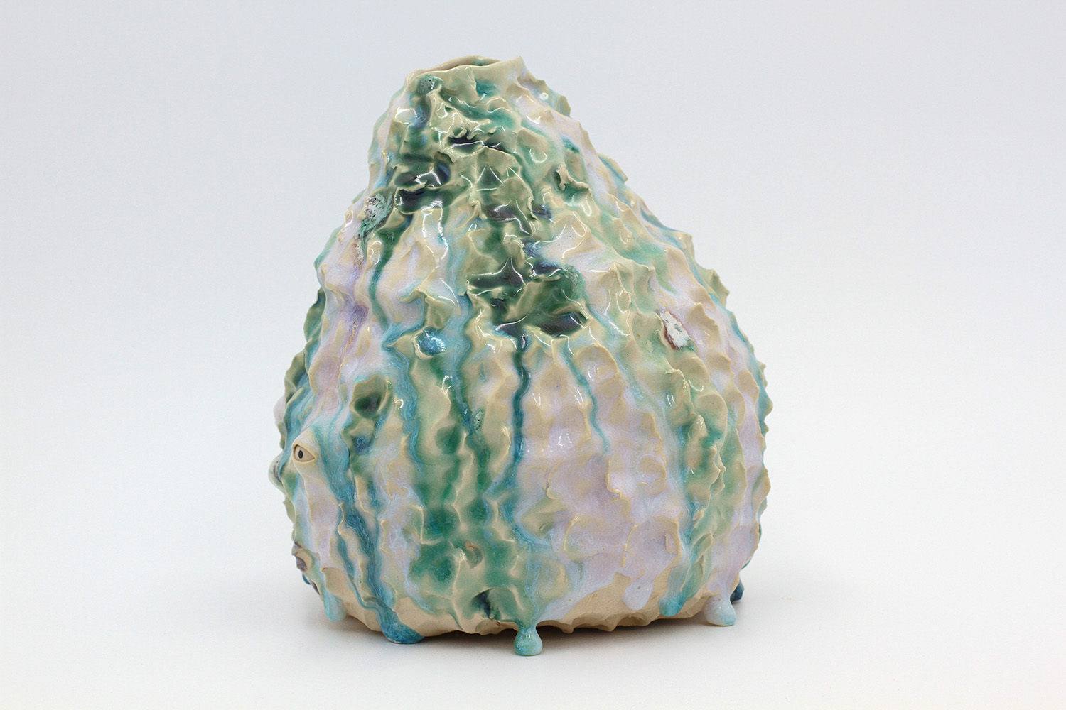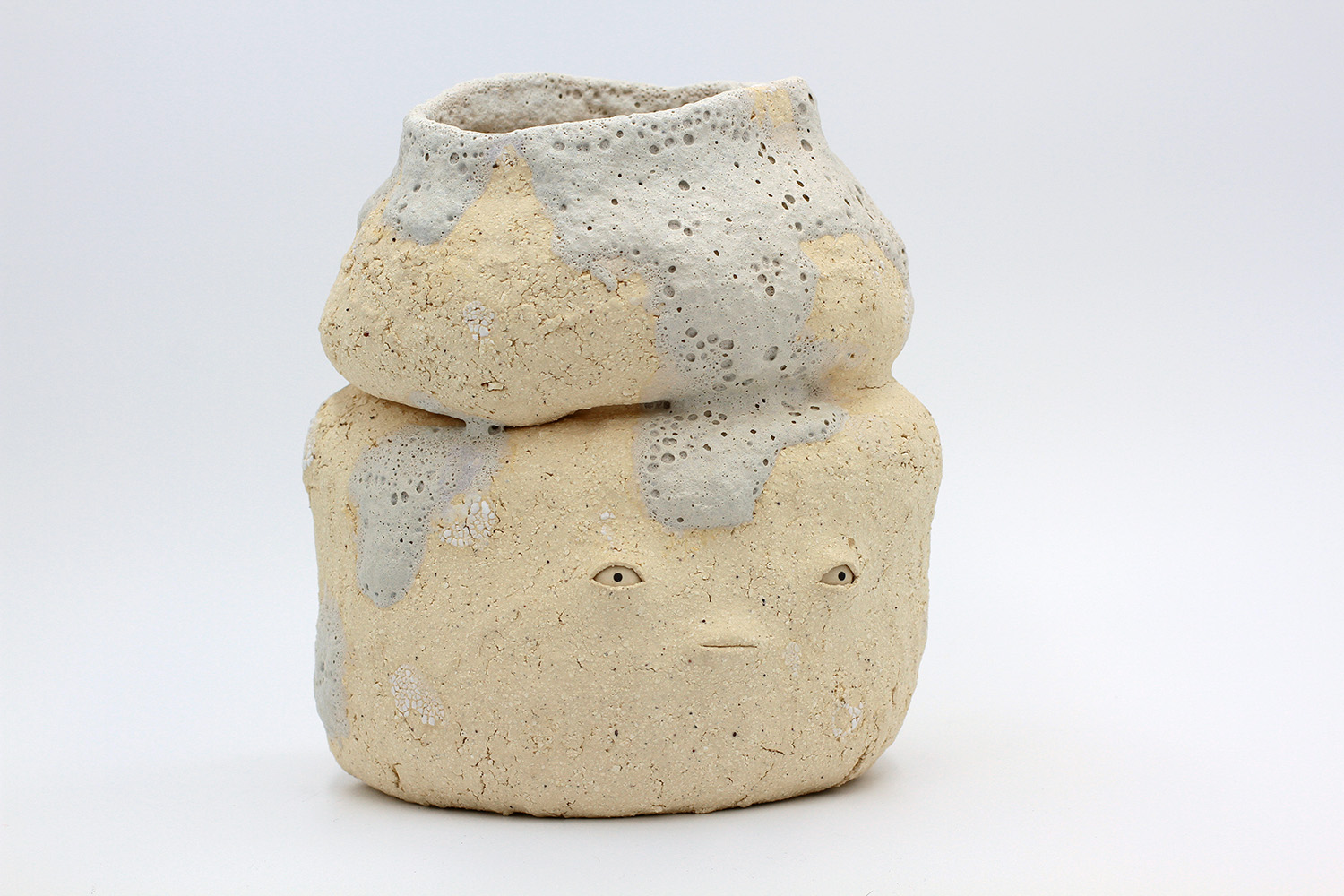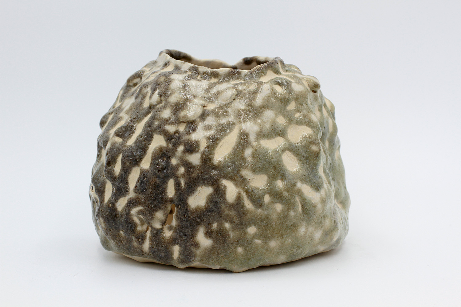 i'm a sculptural pot with bits of crackly lumpy glaze all over me. the cracks in me are intentional. |