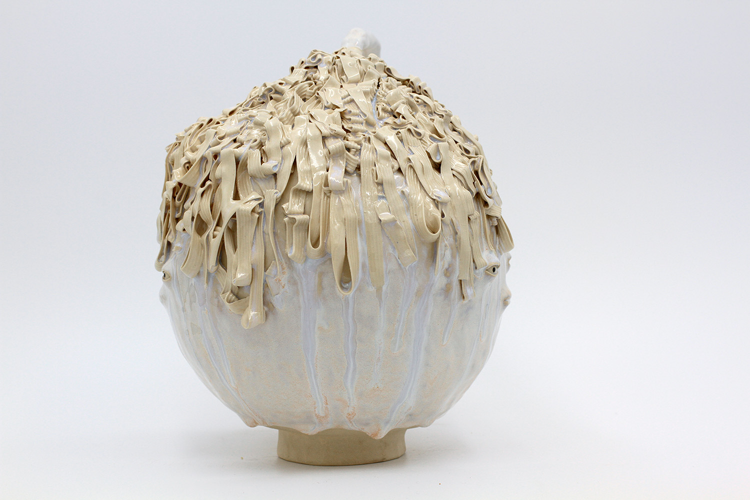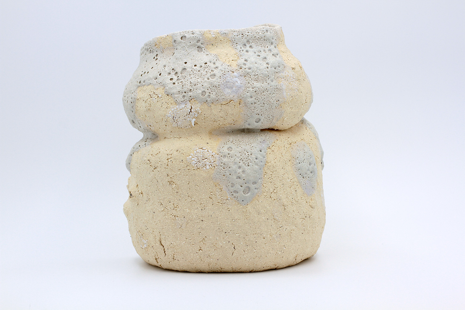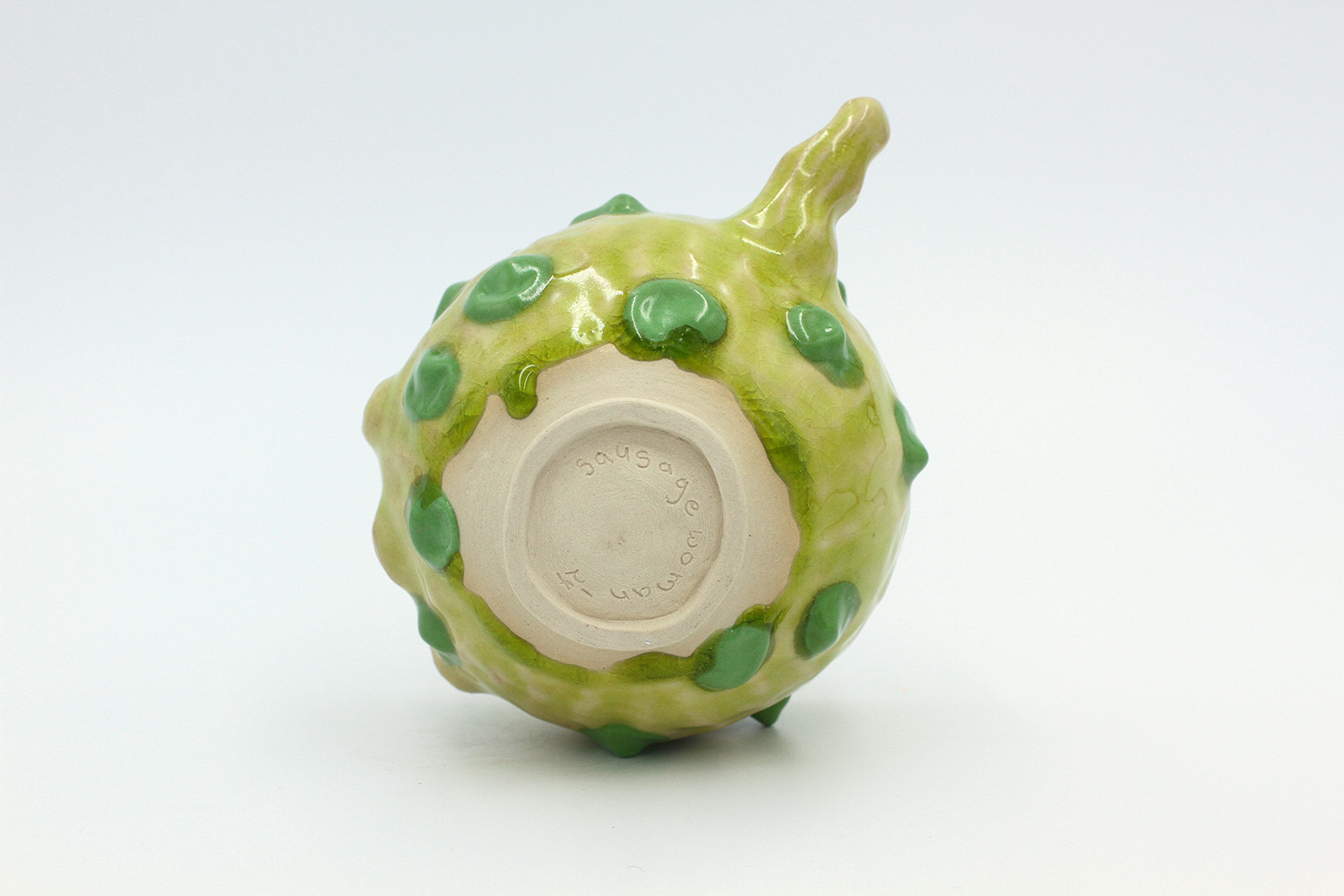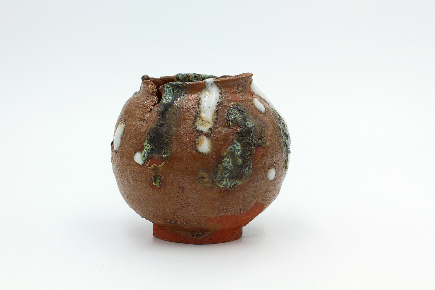 i'm a sculptural pot with bits of crackly lumpy glaze all over me. the cracks in me are intentional. |