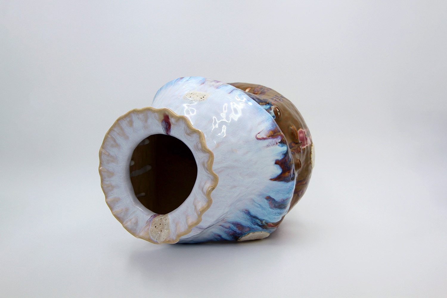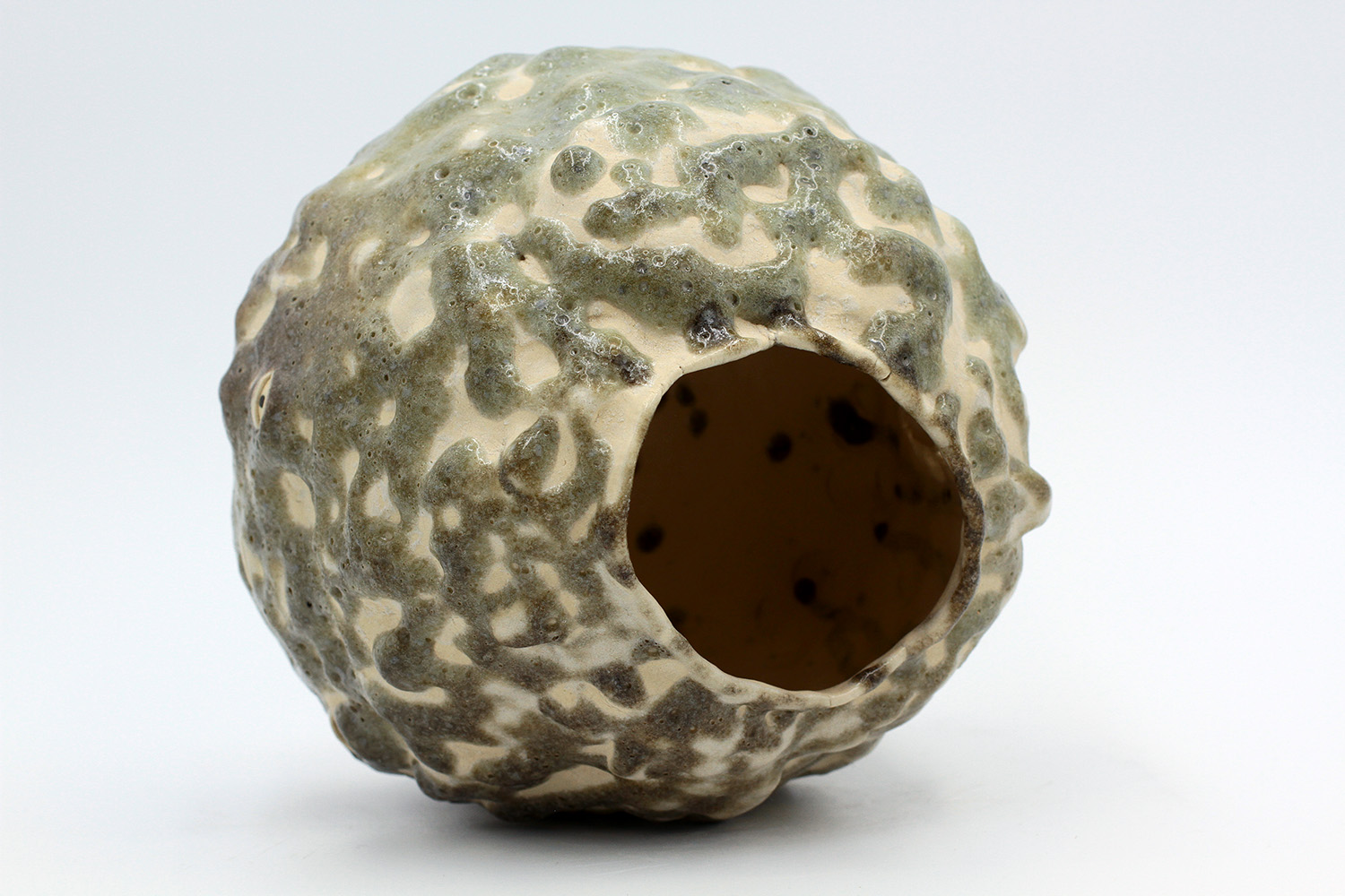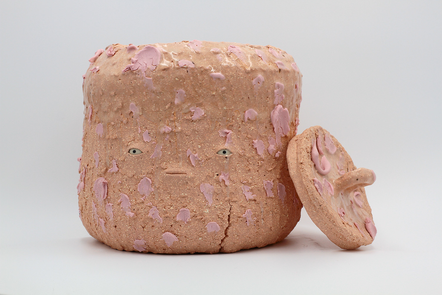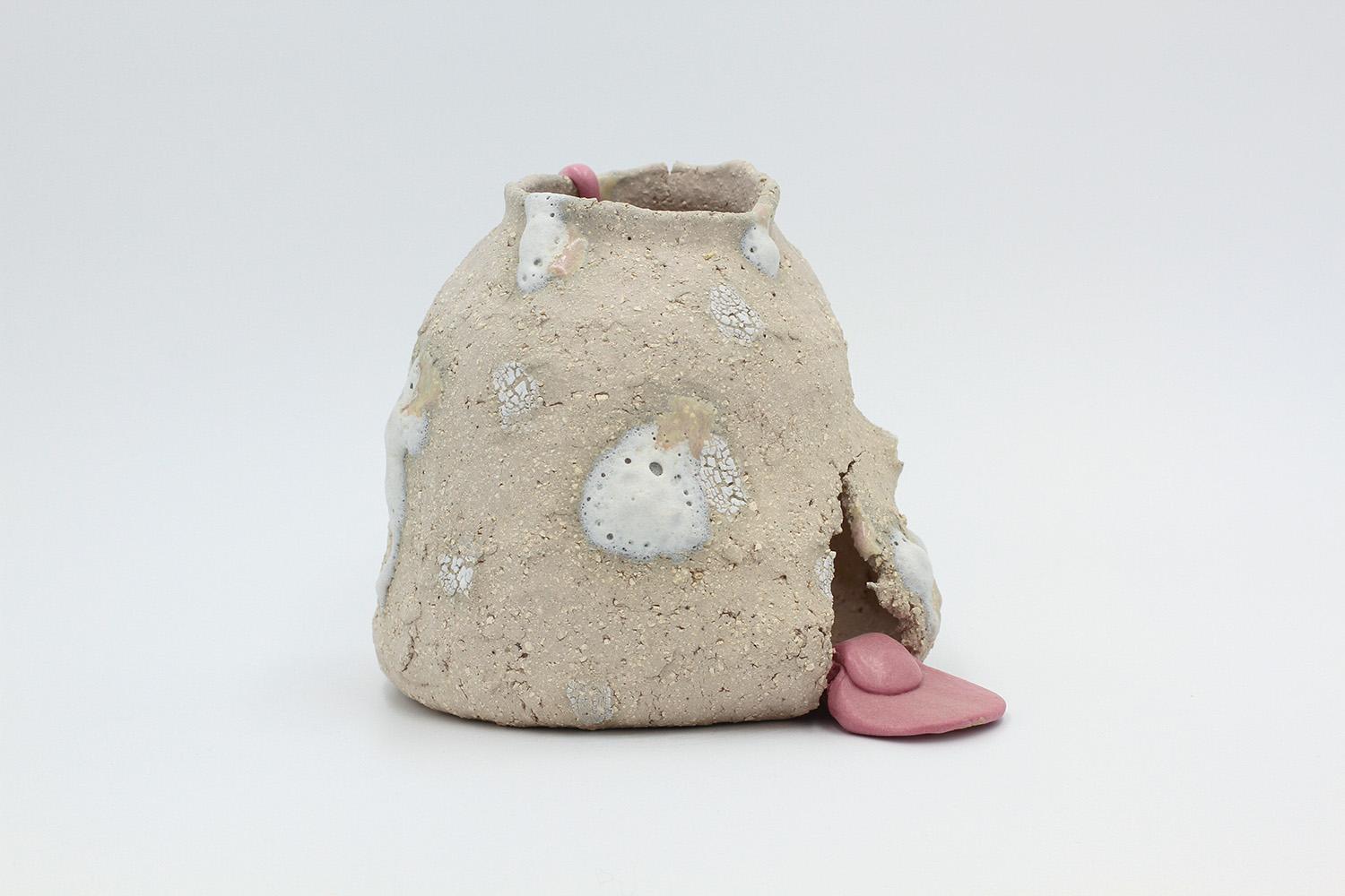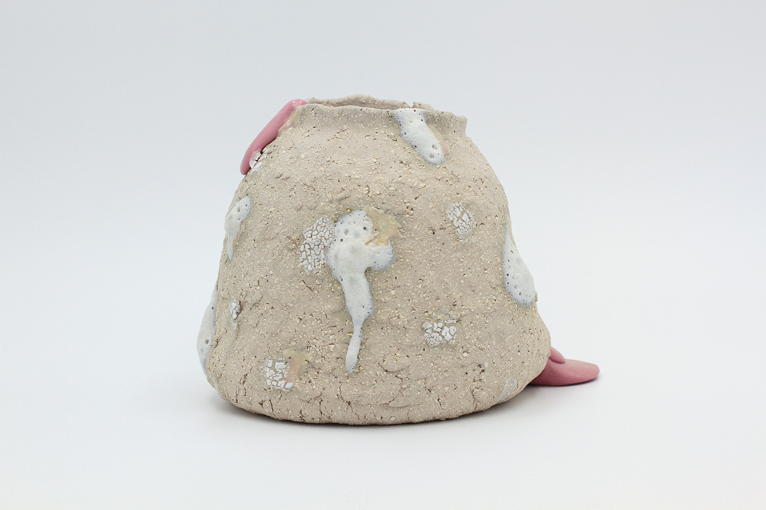 i'm a sculptural pot with bits of crackly lumpy glaze all over me. the cracks in me are intentional. |