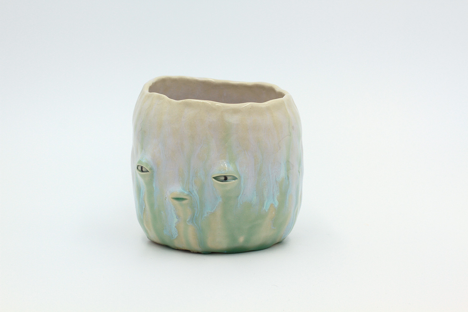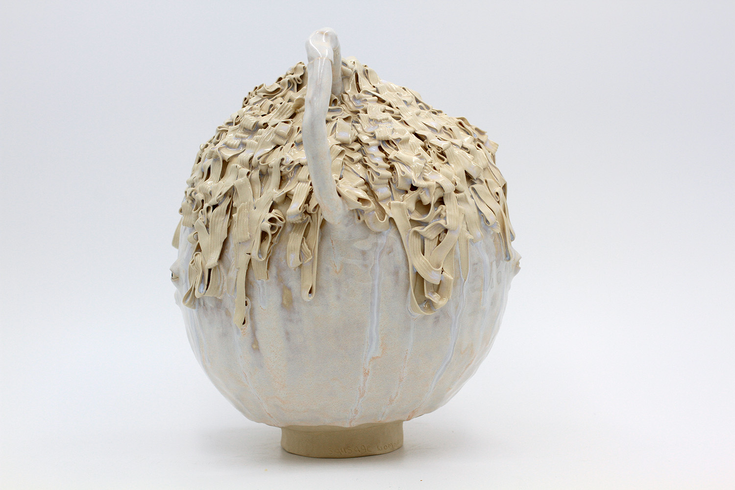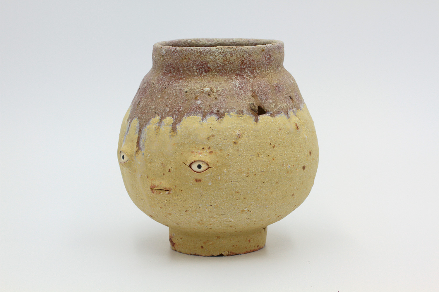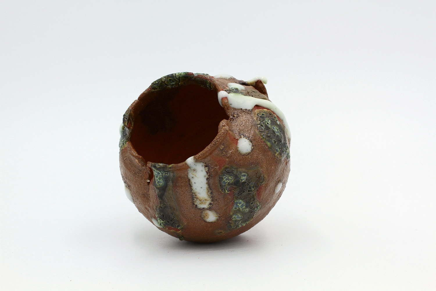 i'm a sculptural pot with bits of crackly lumpy glaze all over me. the cracks in me are intentional. |