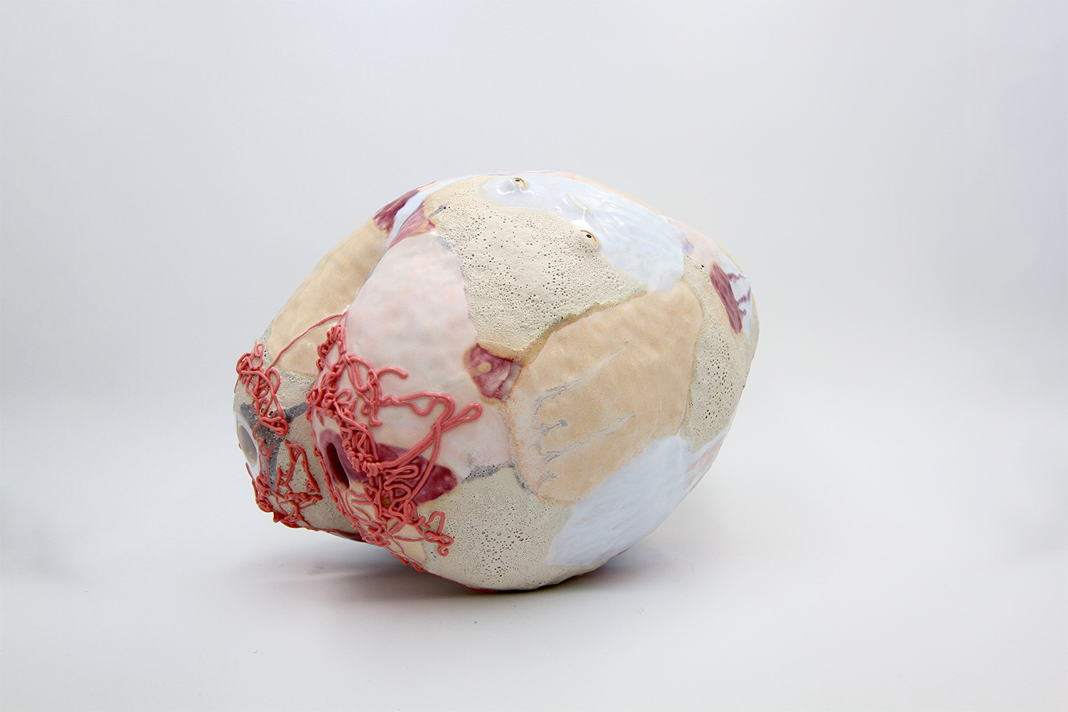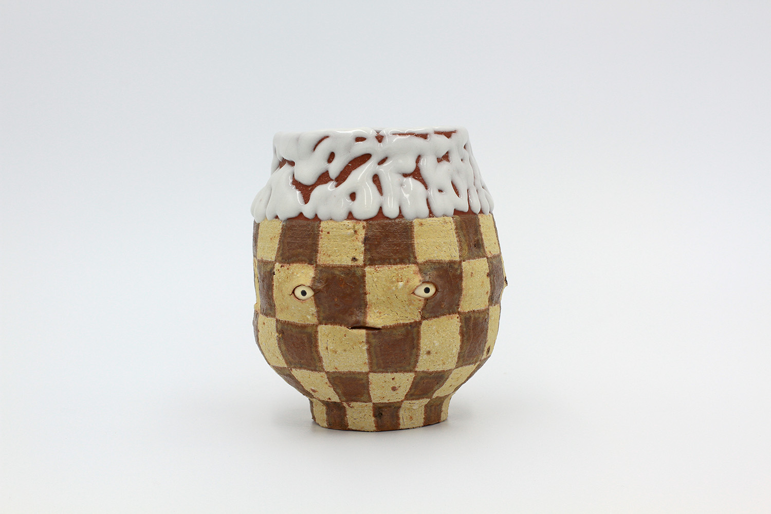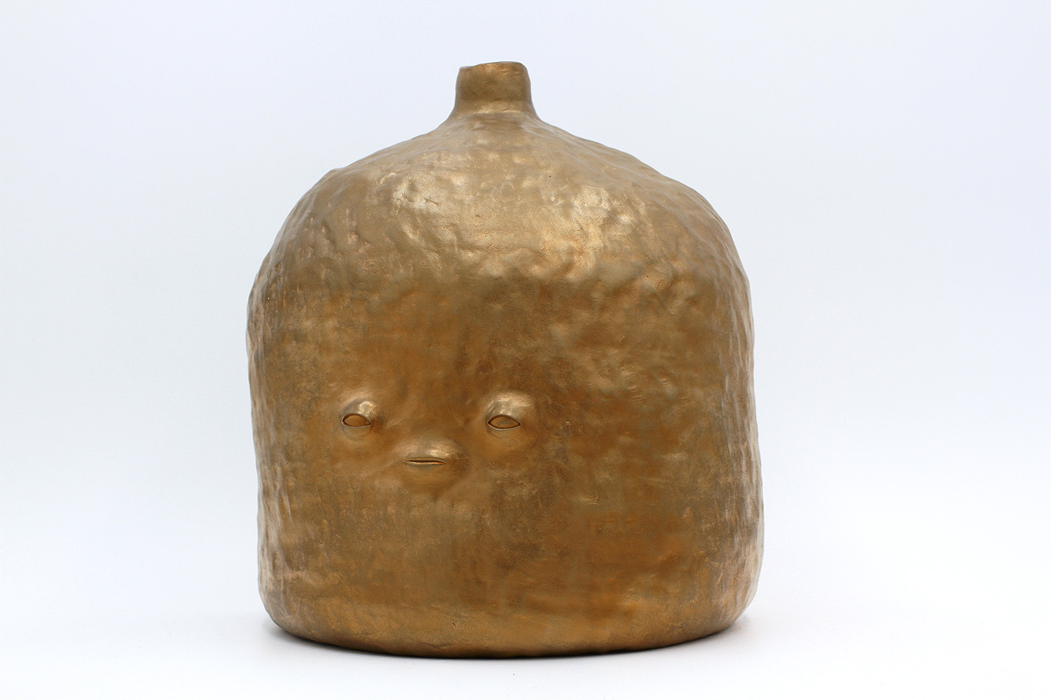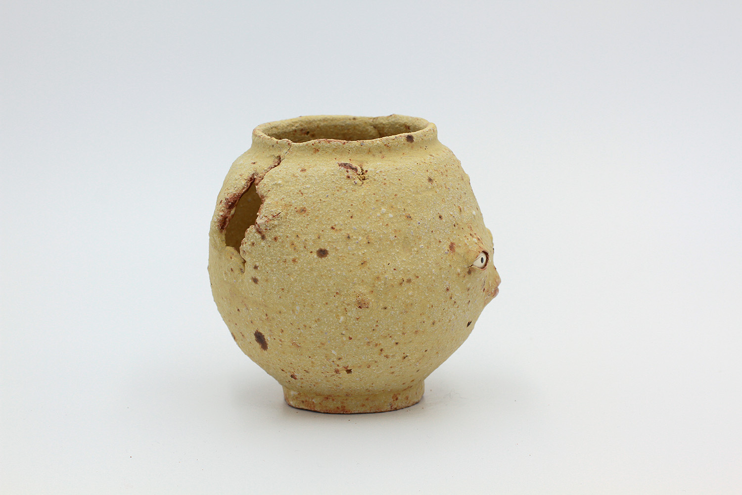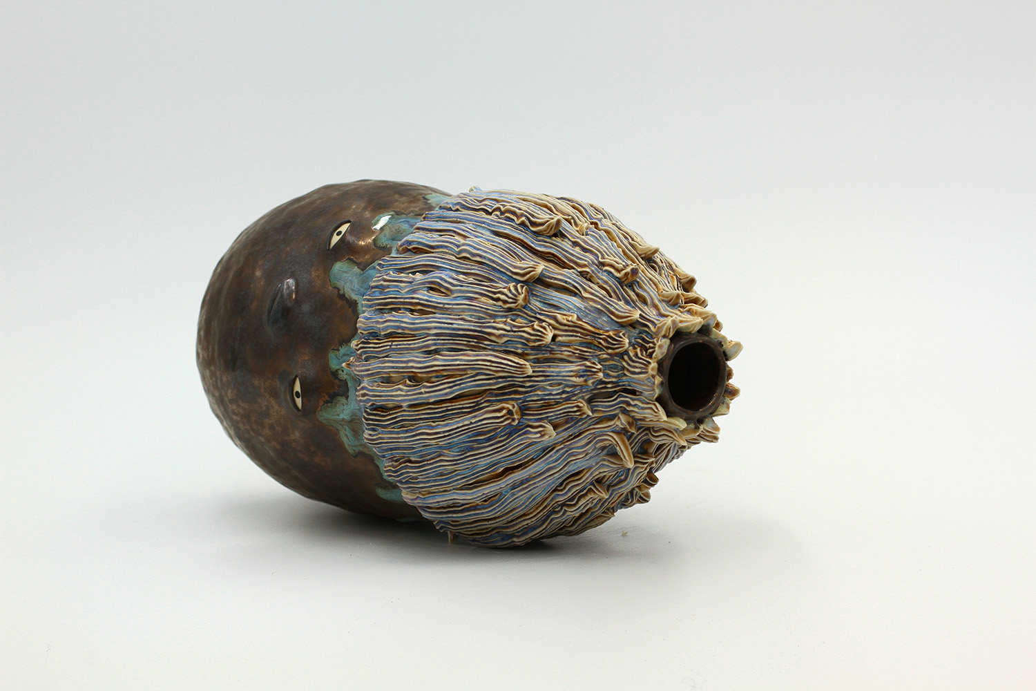 i'm a sculptural pot with bits of crackly lumpy glaze all over me. the cracks in me are intentional. |