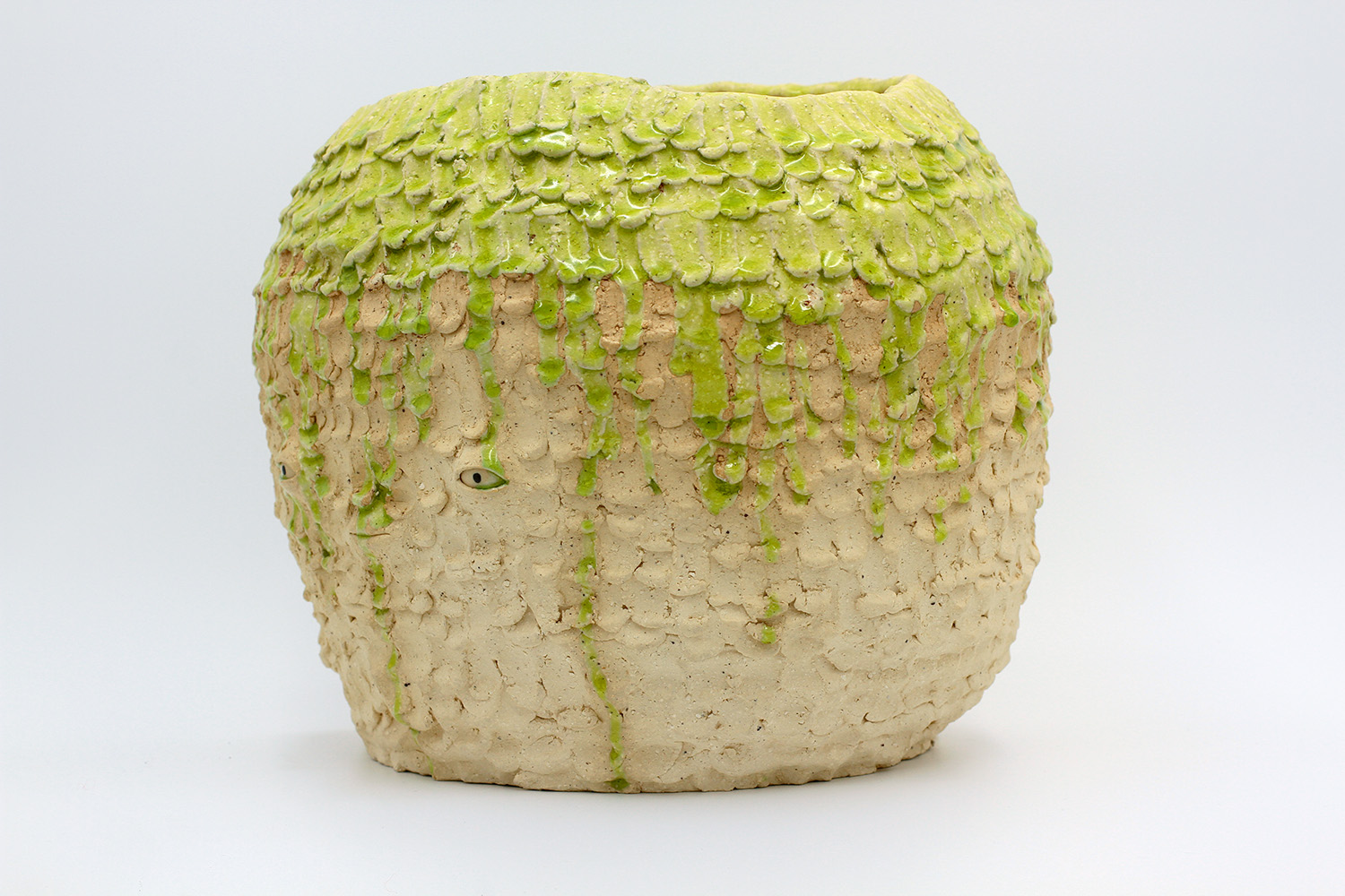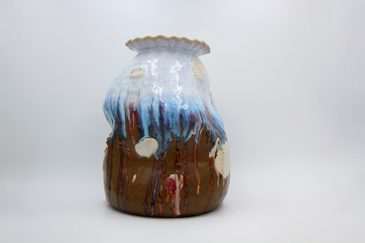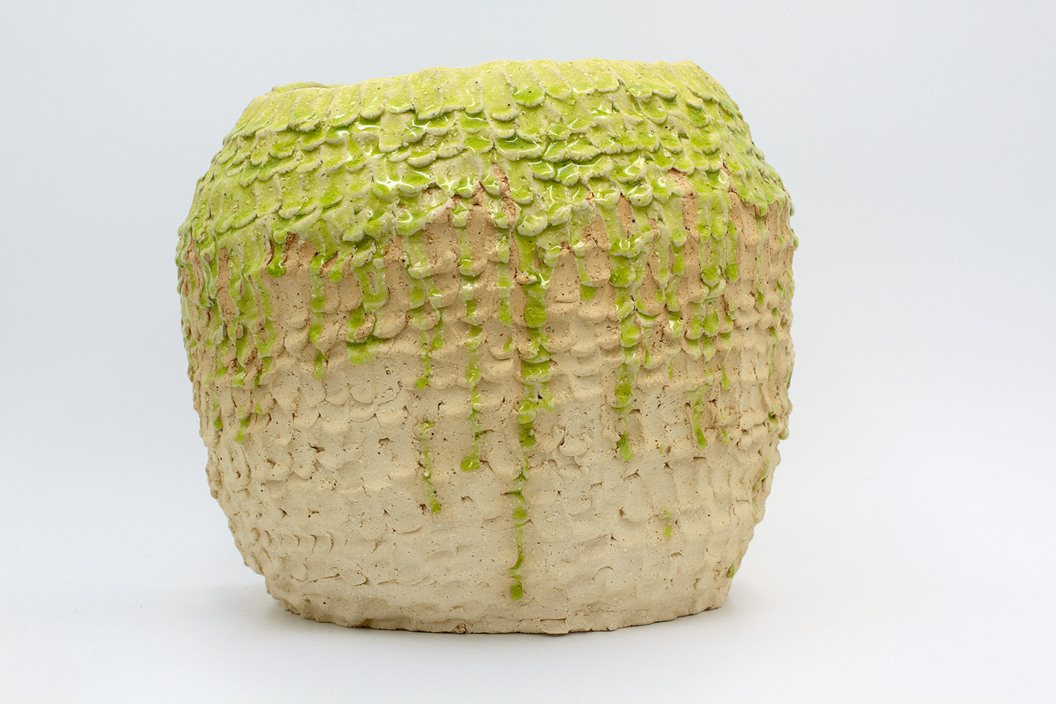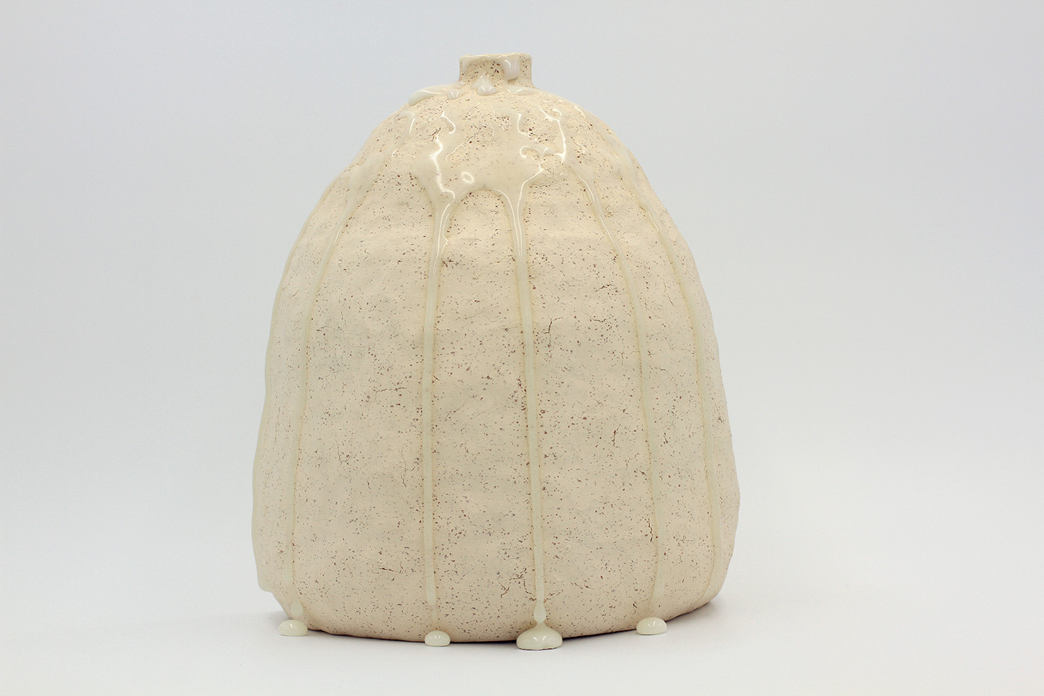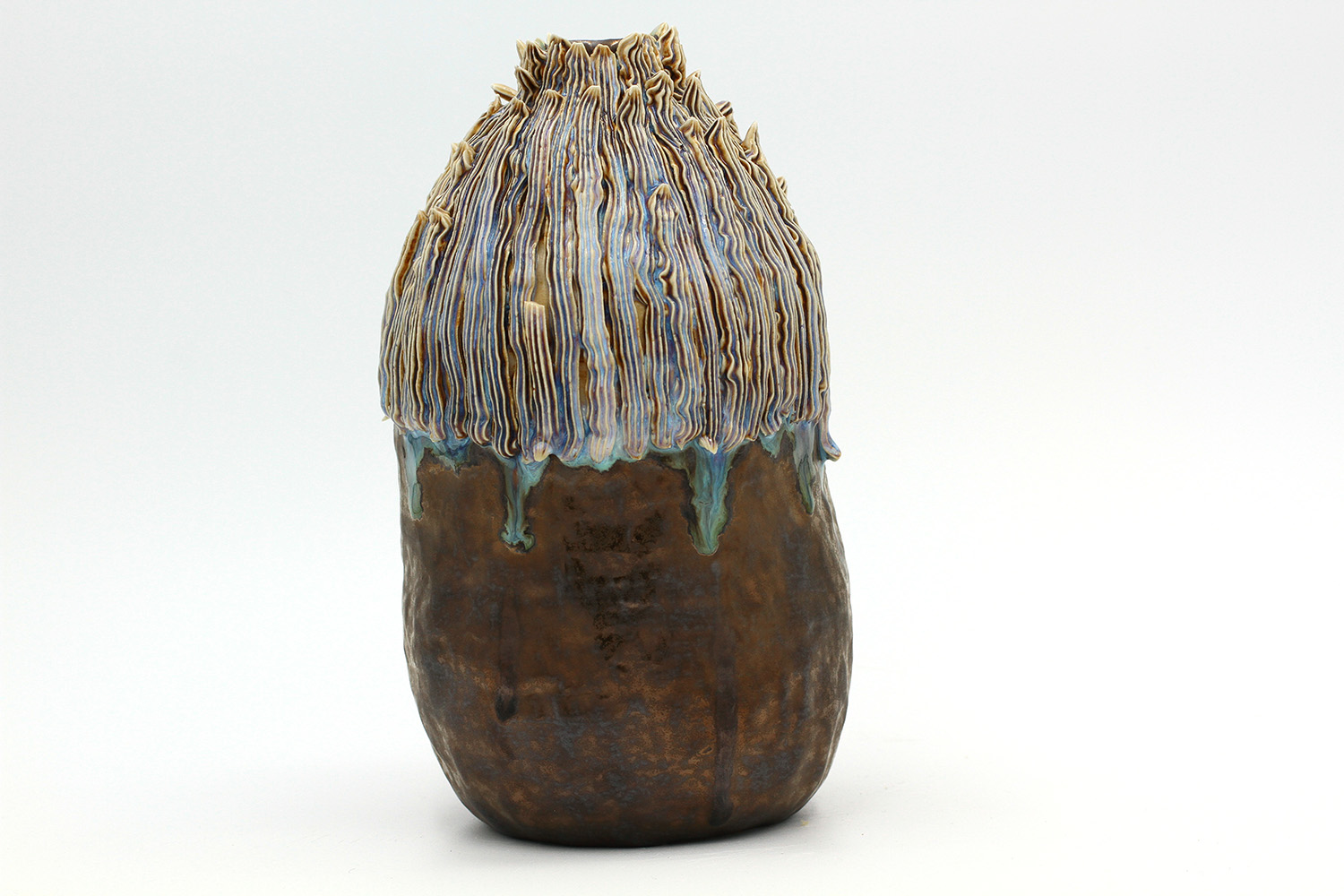 i am an ornamental vase with a rough textured body and drippy milky glaze. |
