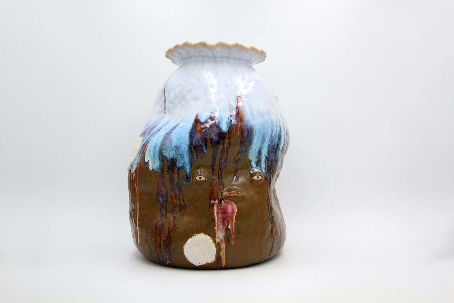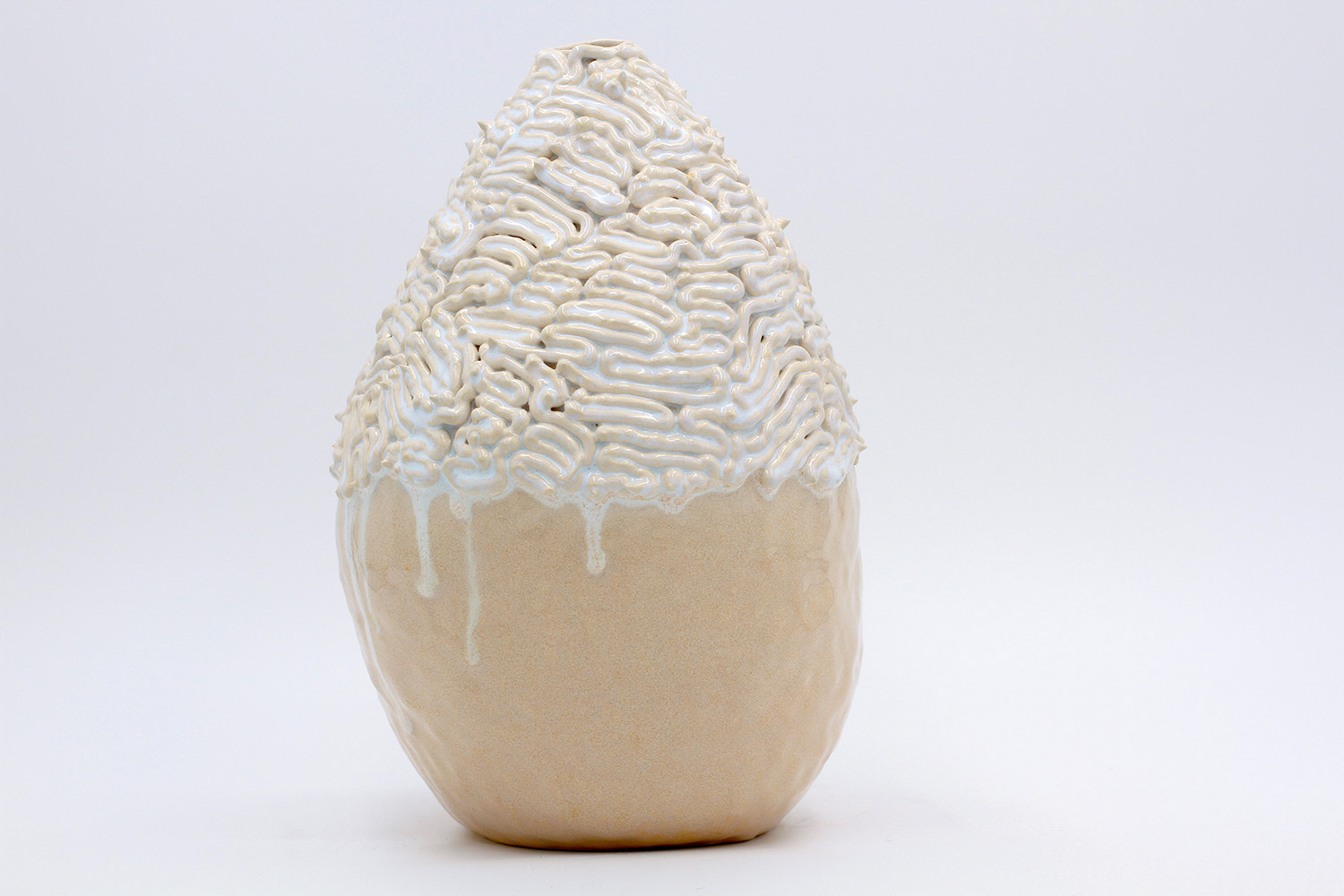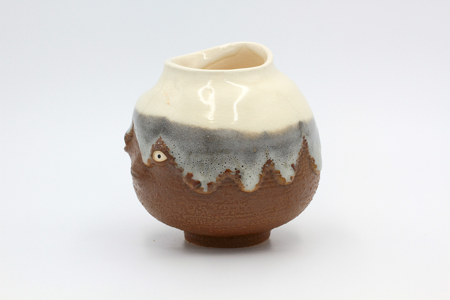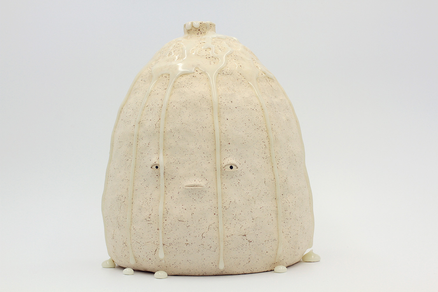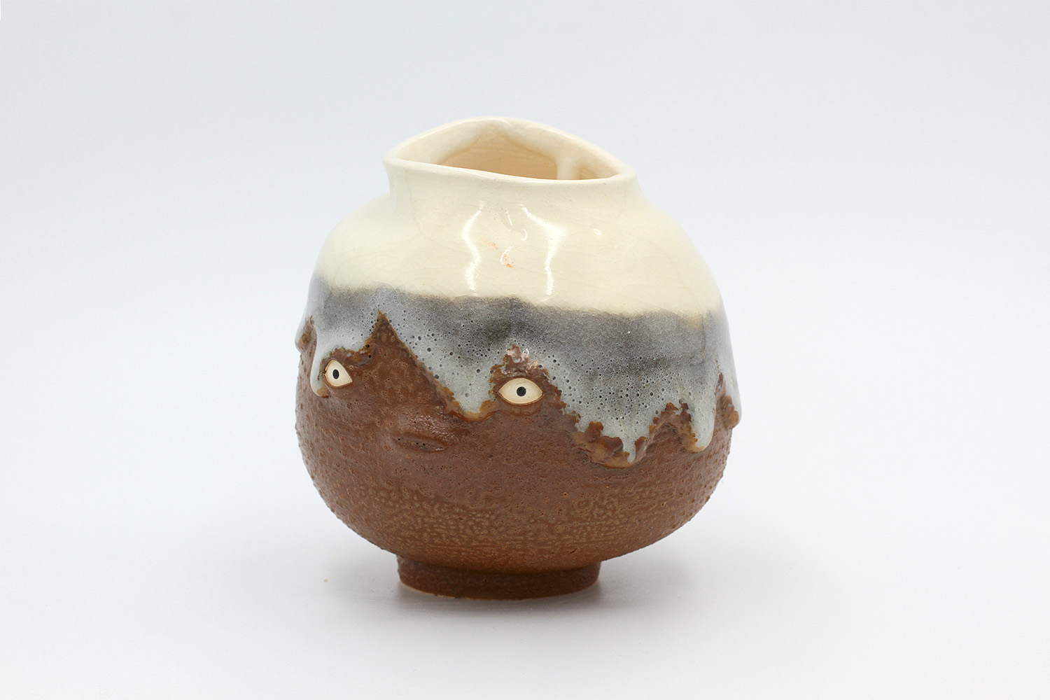 i am an ornamental vase with a rough textured body and drippy milky glaze. |