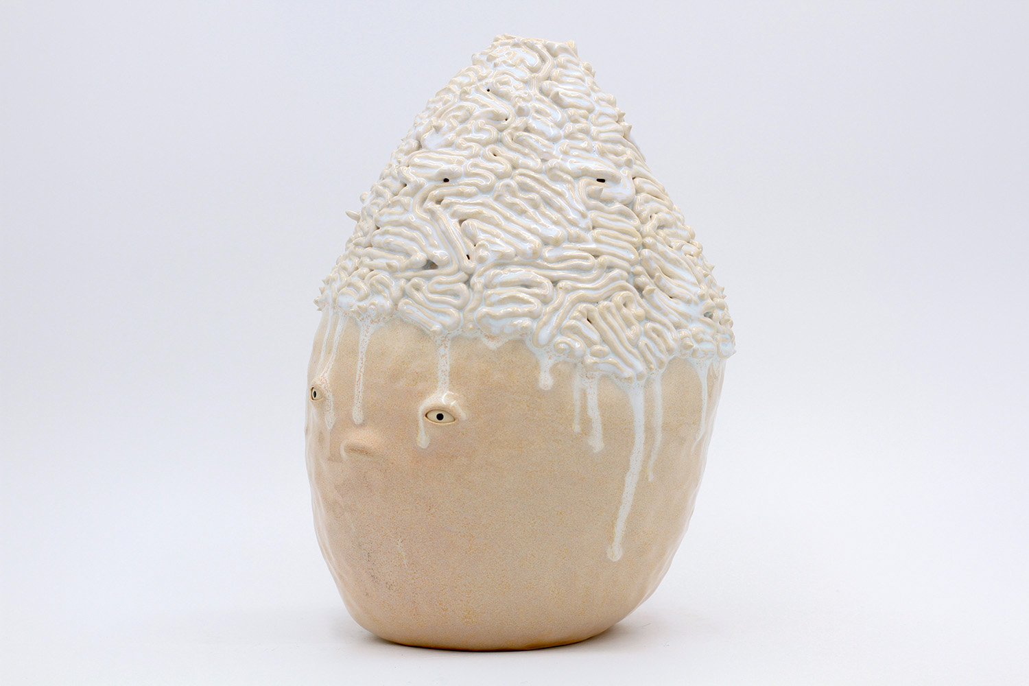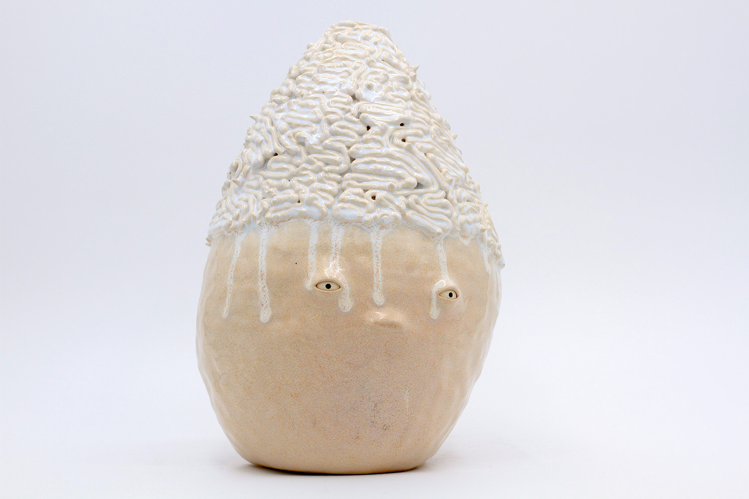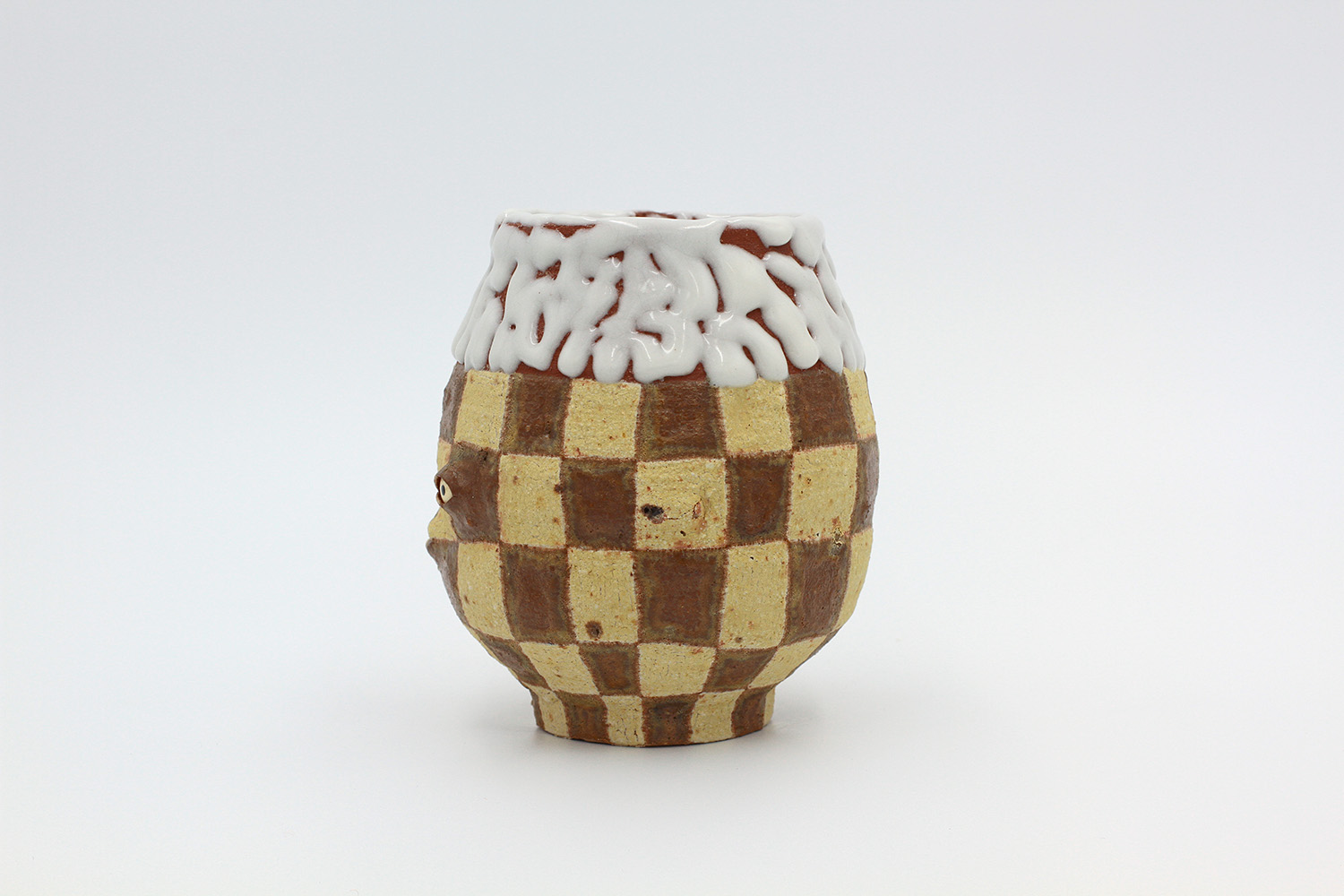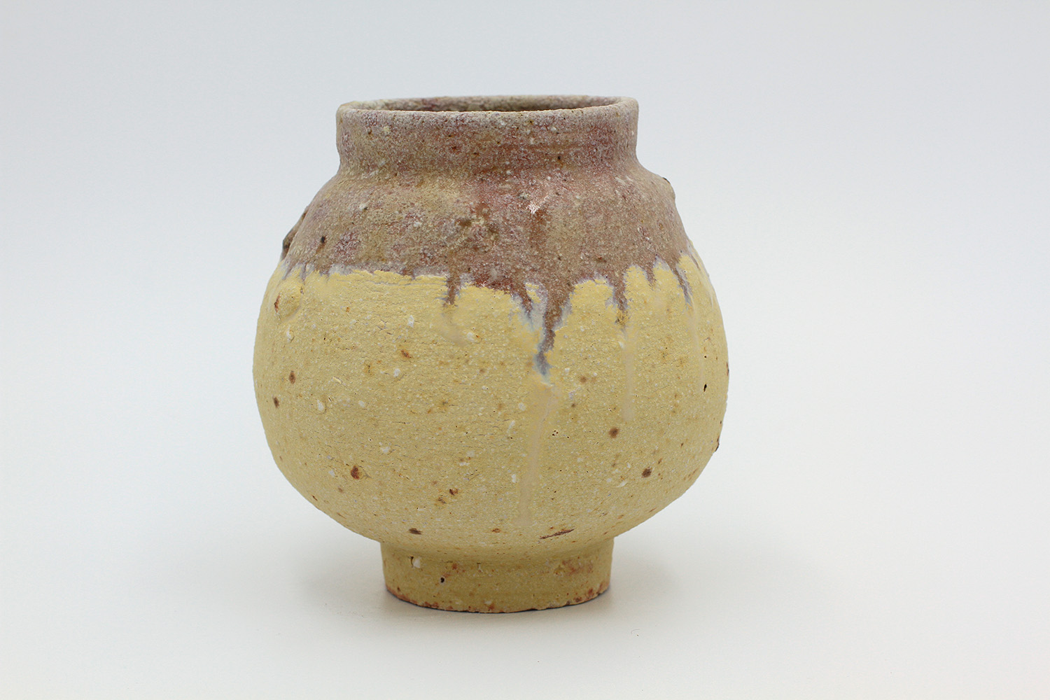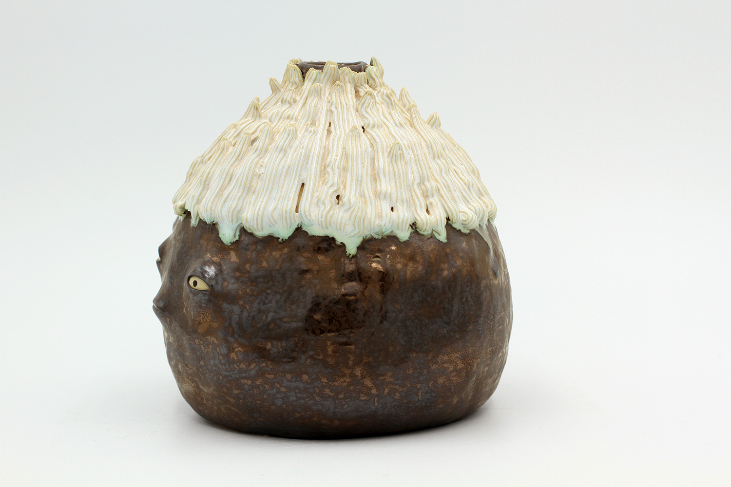 i am an ornamental vase with a rough textured body and drippy milky glaze. |