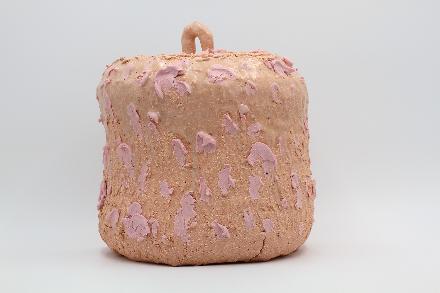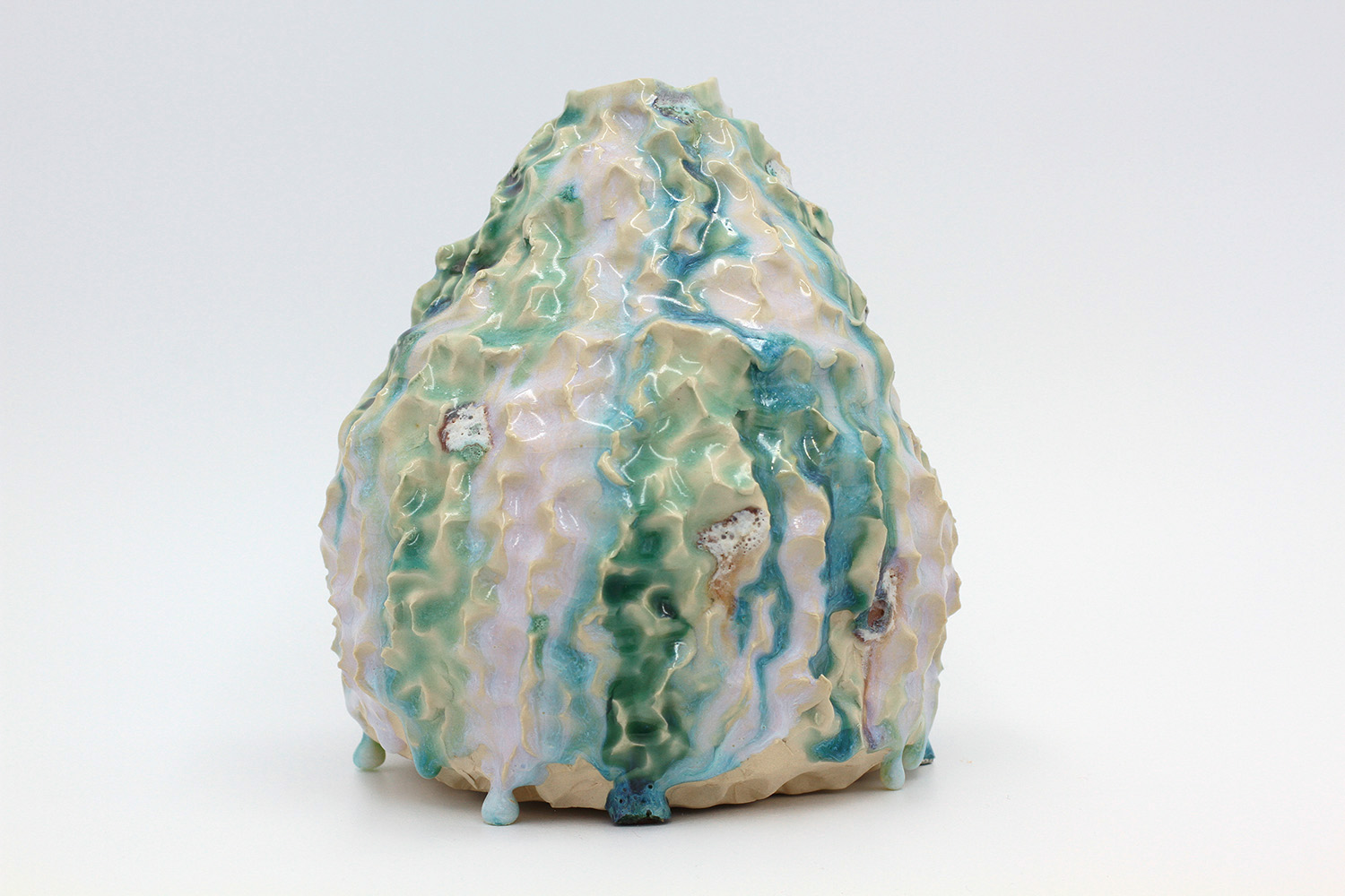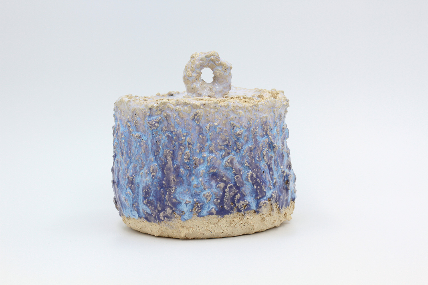 i am a sculptural jar with lots of texture from my grogged body and gloop glaze. |