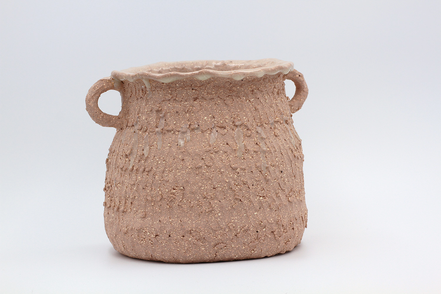 i am a pot with a rough texture on the outside and a thick milky glaze on the inside. |