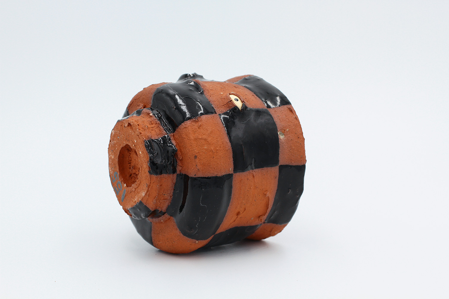 i am a vase with red squiggly red piping on my head. |