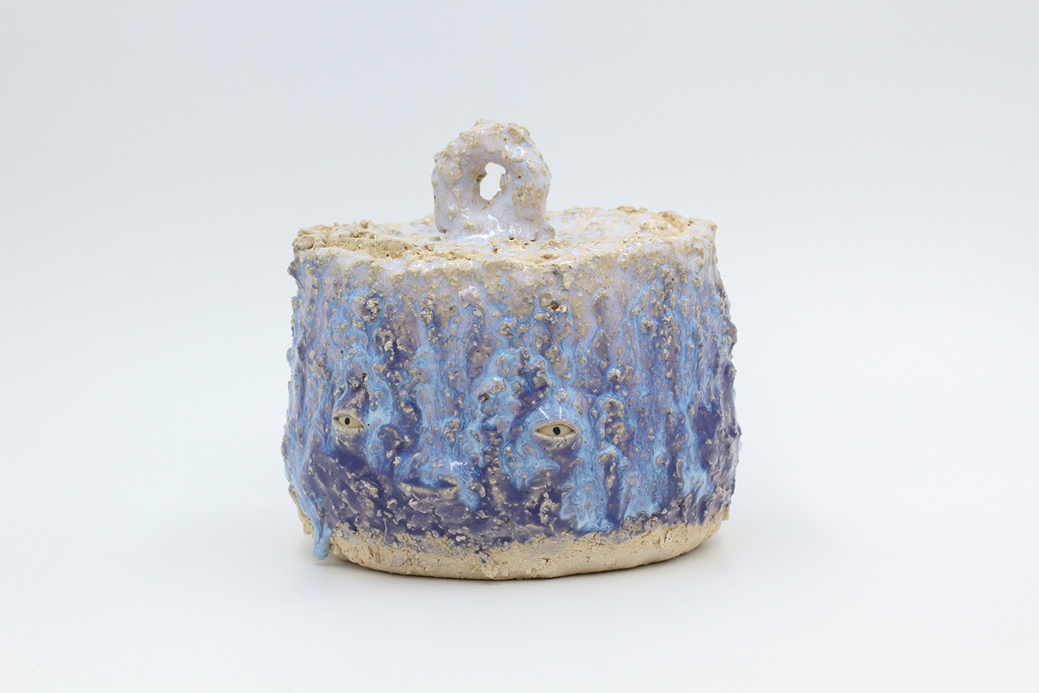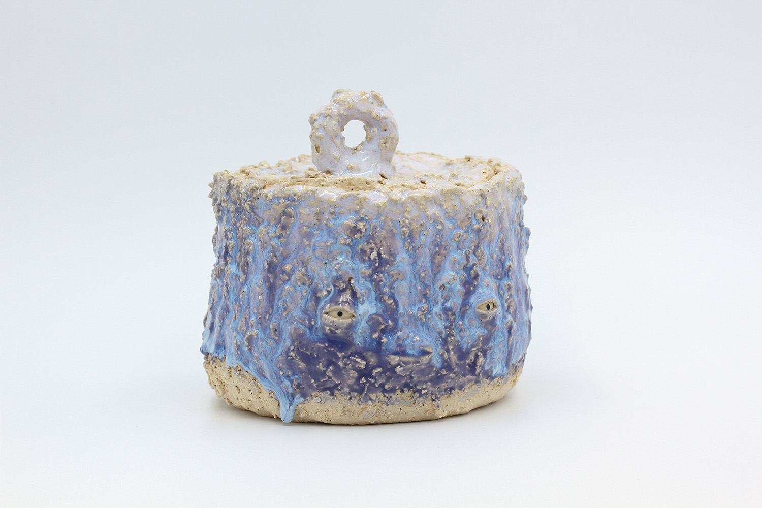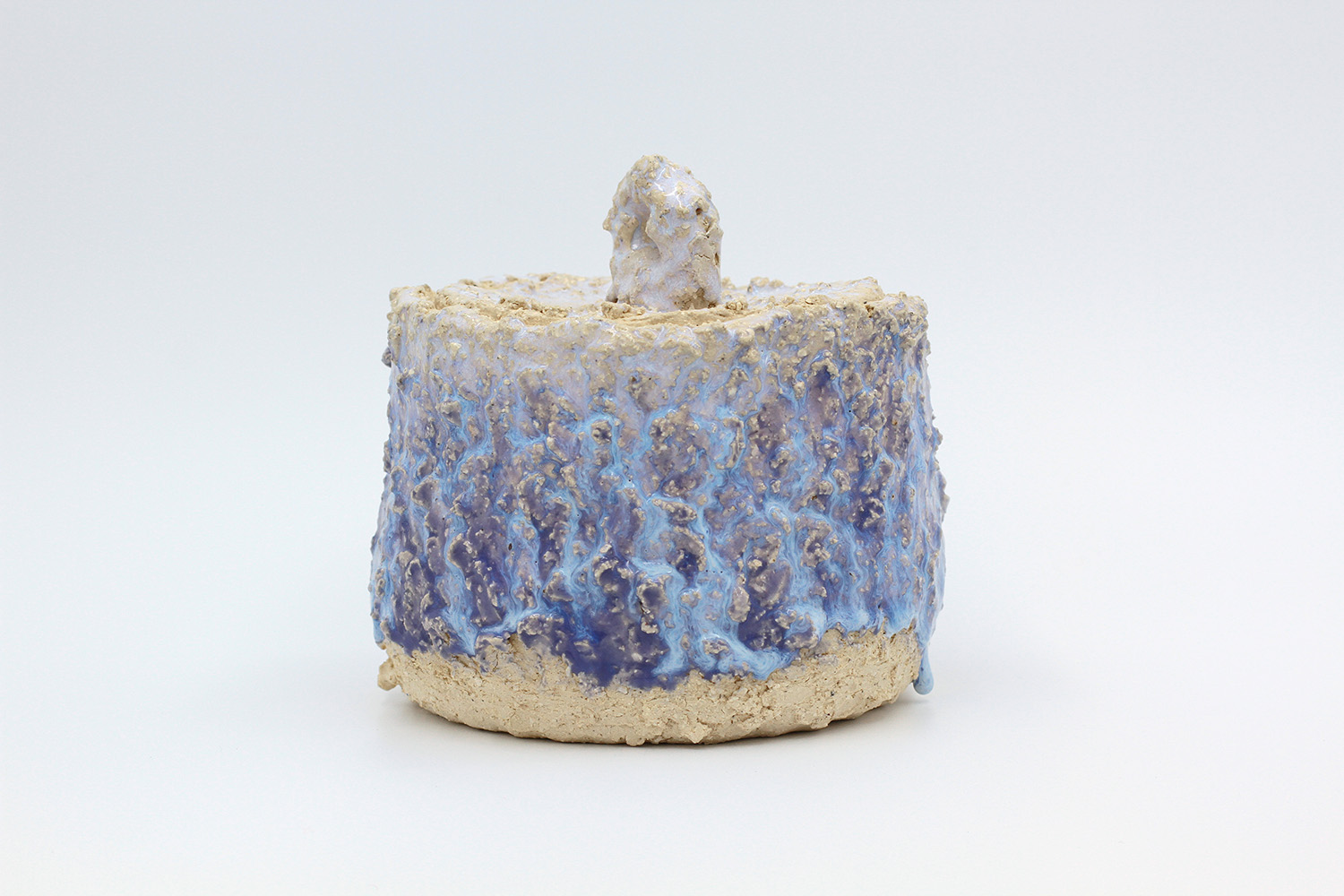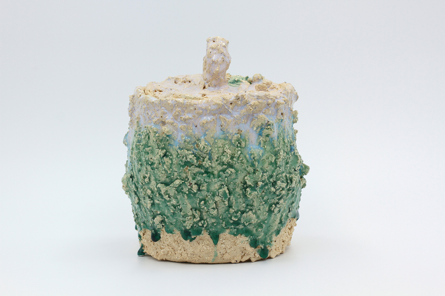 i am a sculptural jar with lots of texture from my grogged body and gloop glaze. |
