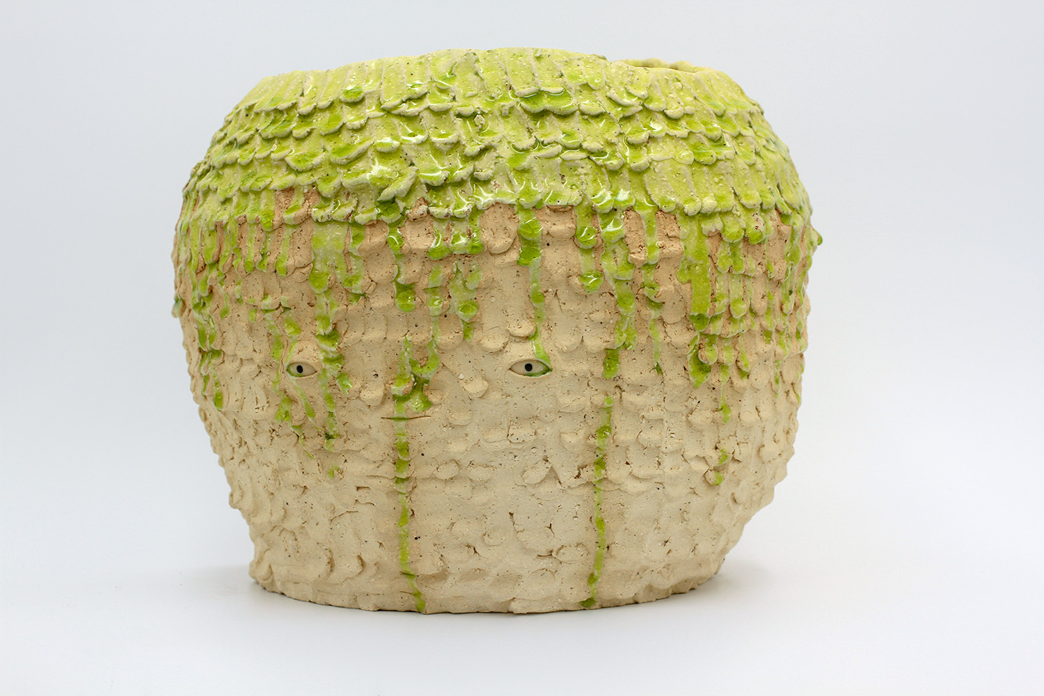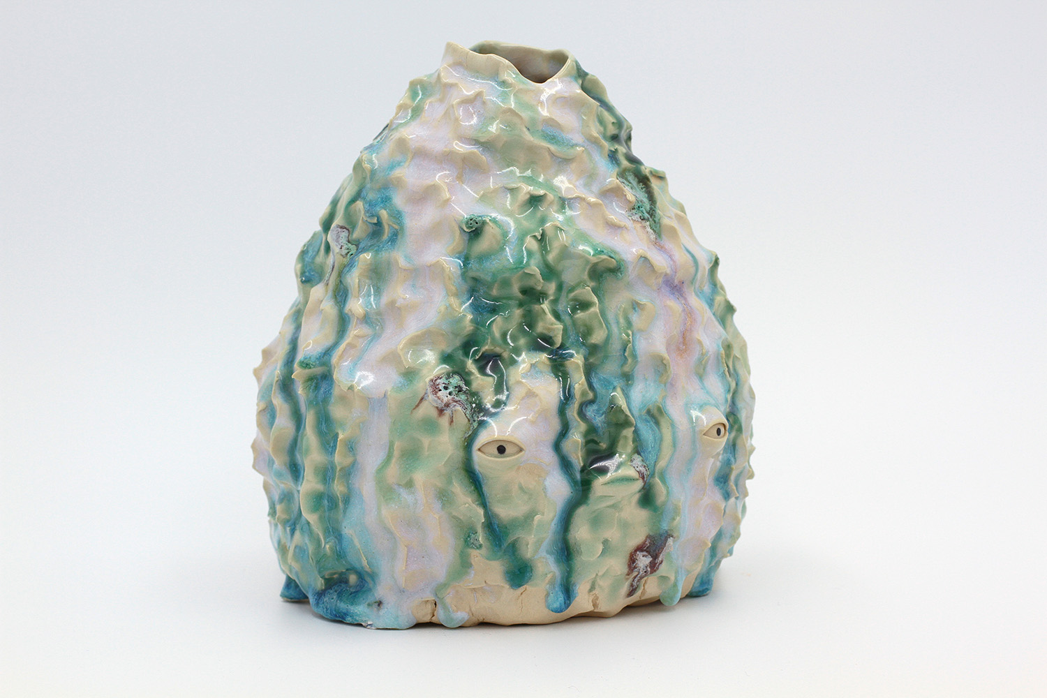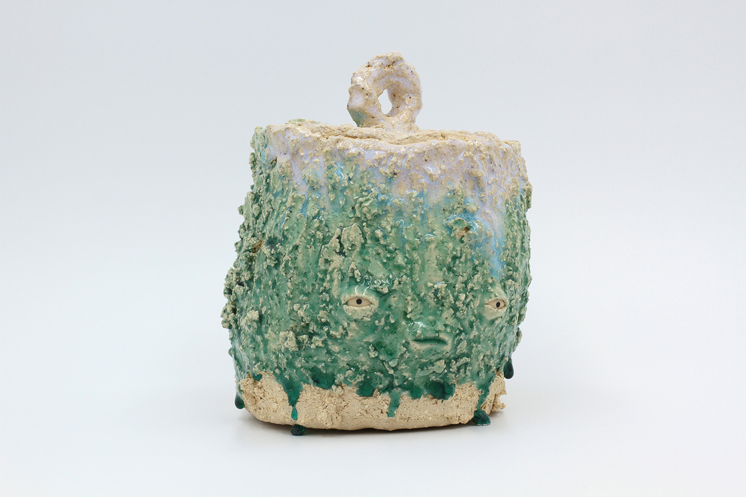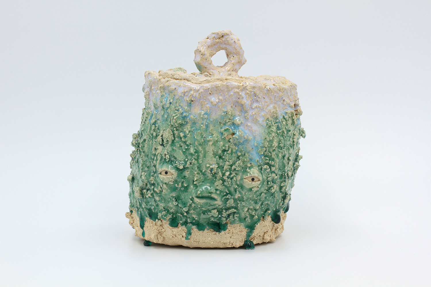 i am a sculptural jar with lots of texture from my grogged body and gloop glaze. |