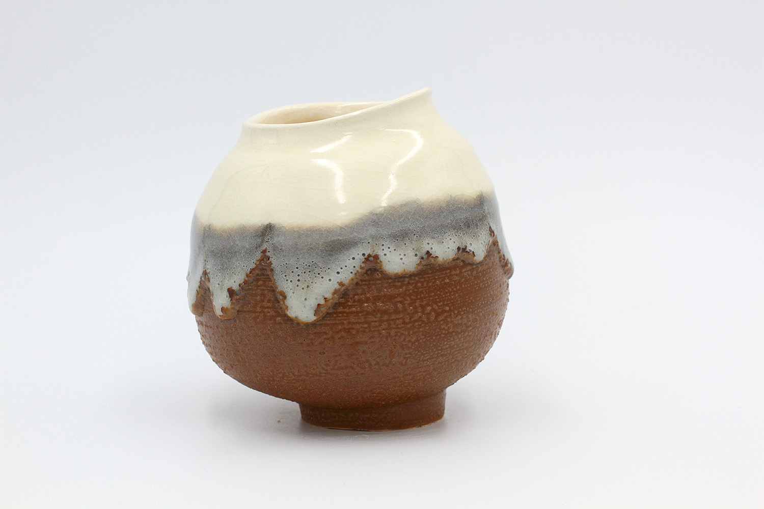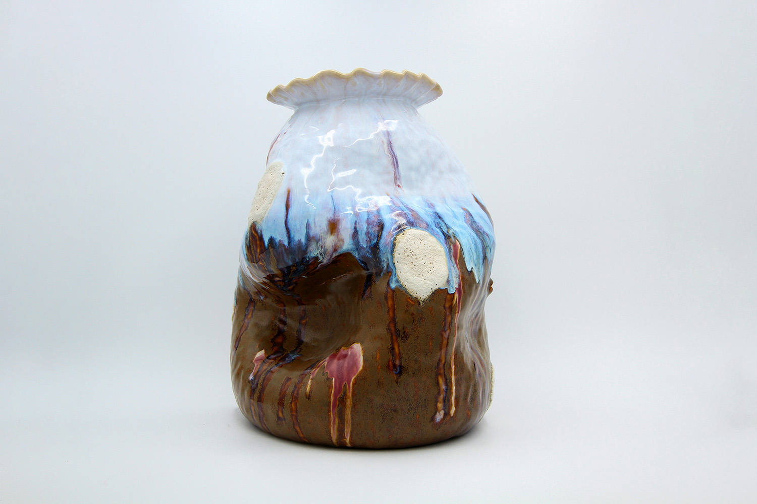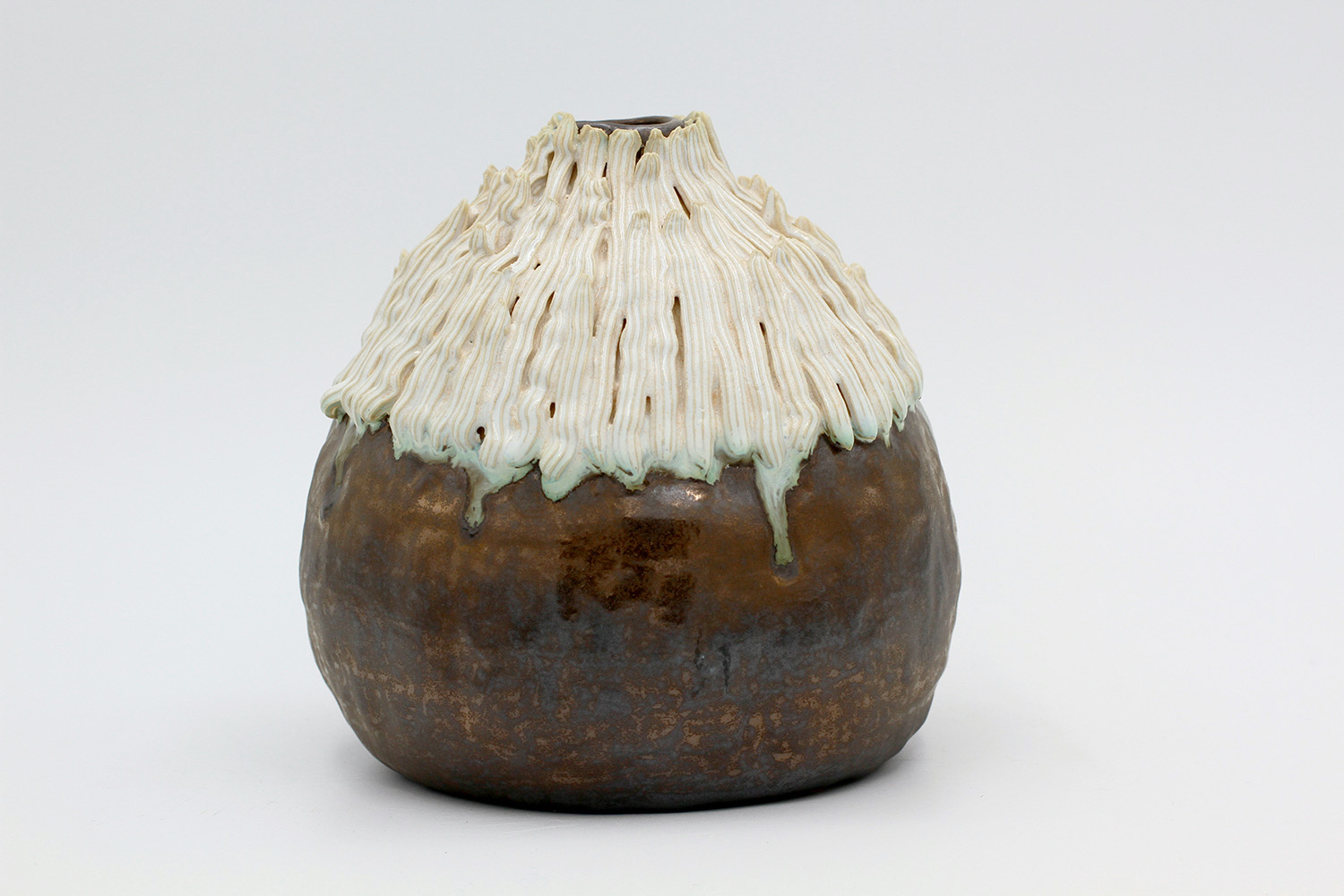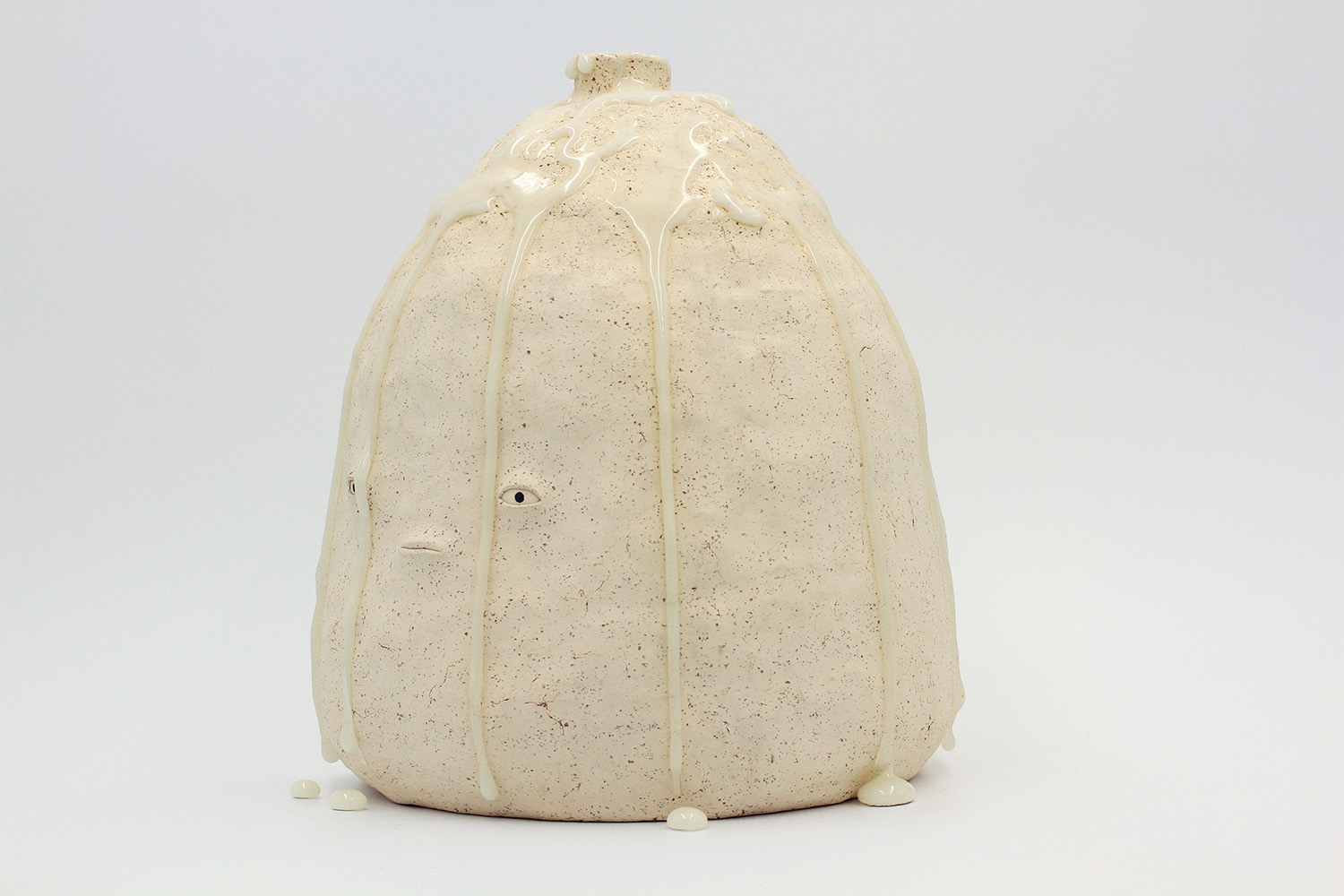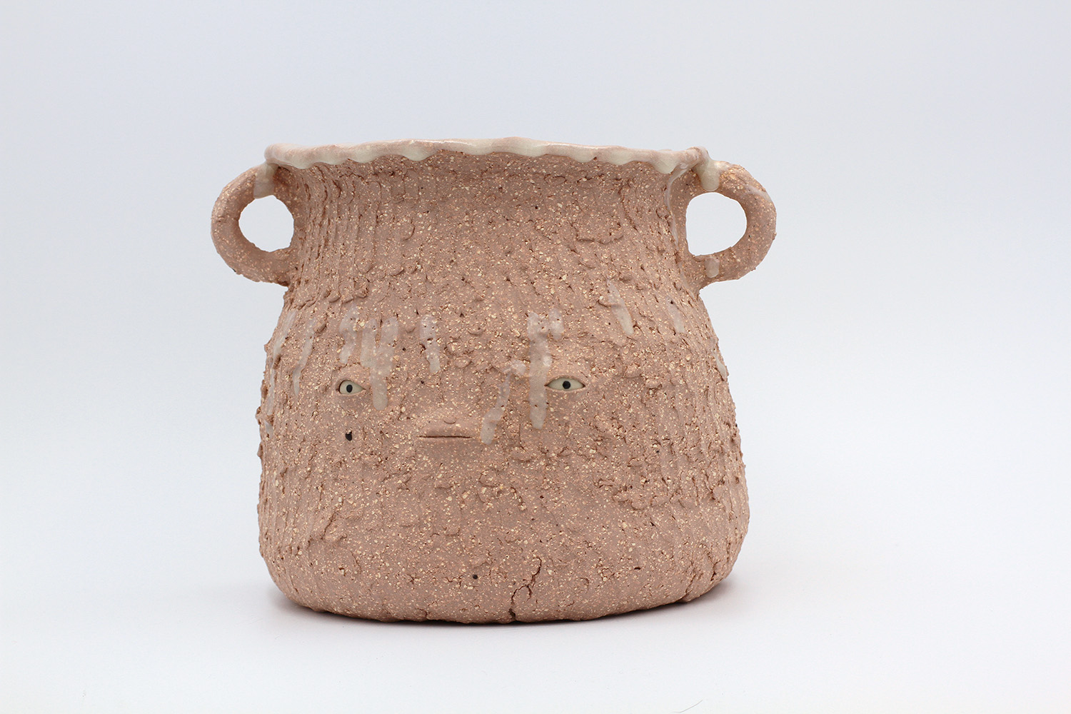 i am an ornamental vase with a rough textured body and drippy milky glaze. |