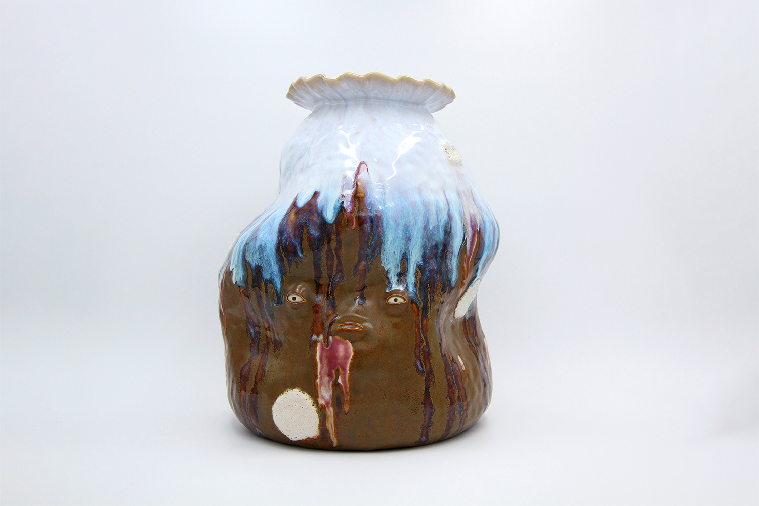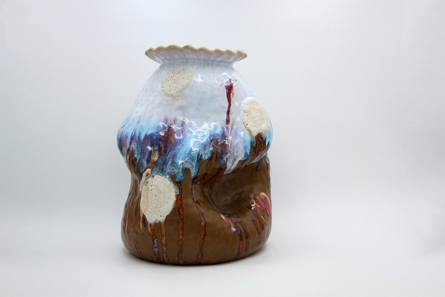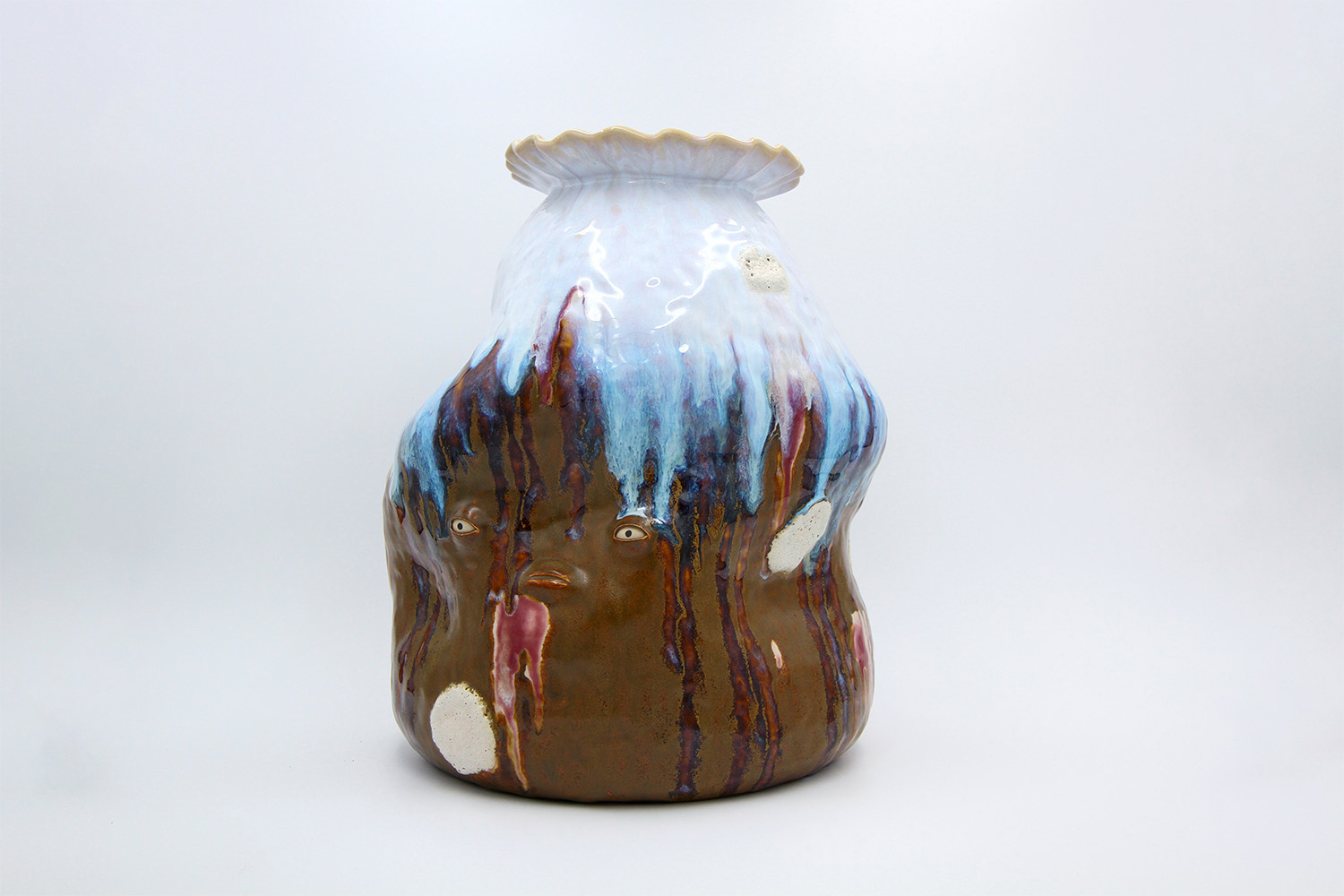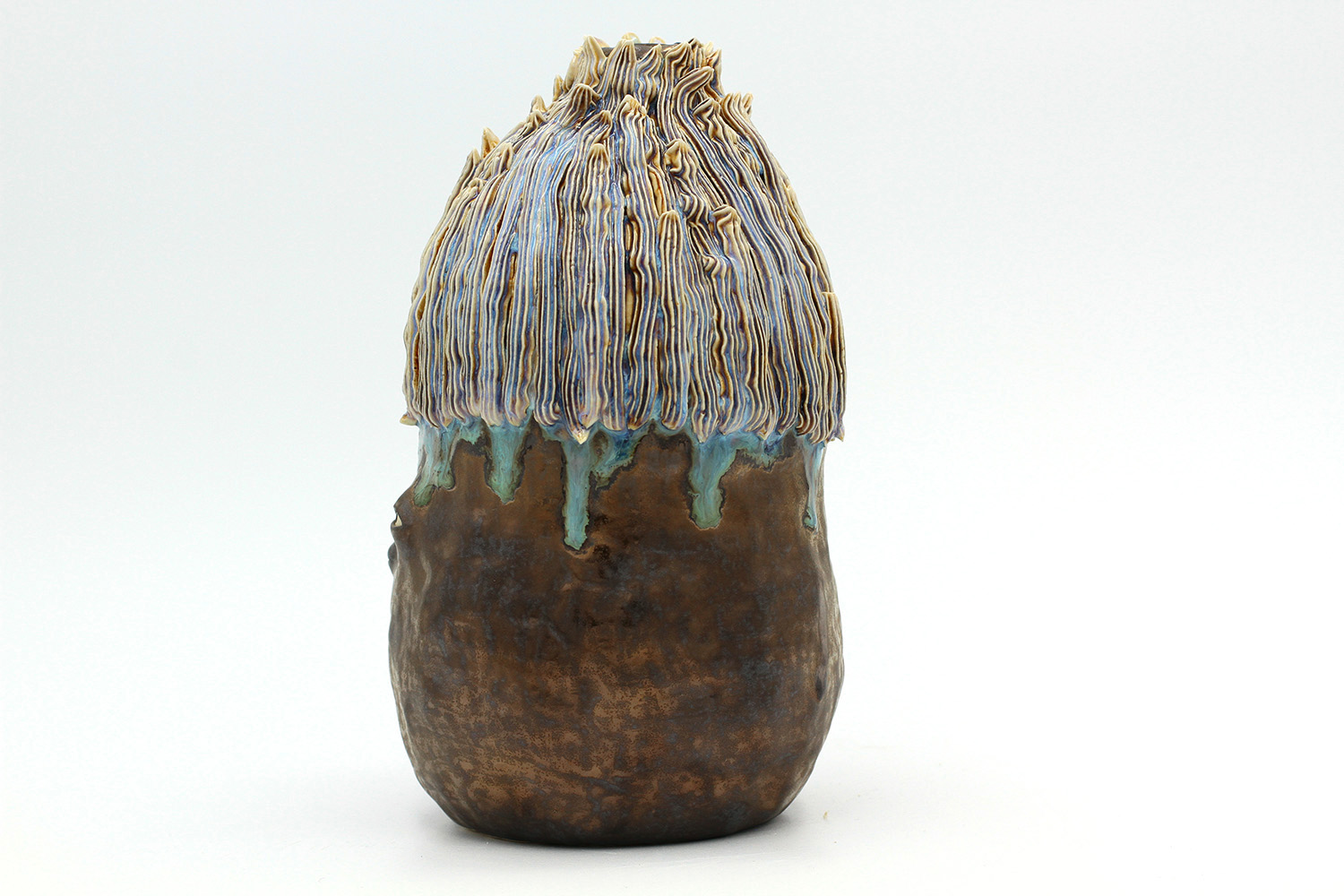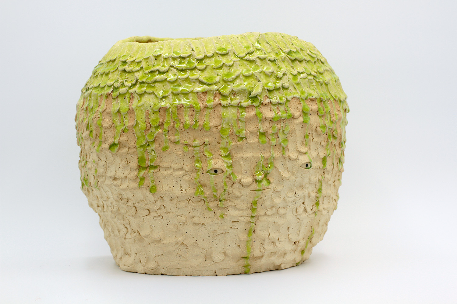 i am an ornamental vase with a rough textured body and drippy milky glaze. |