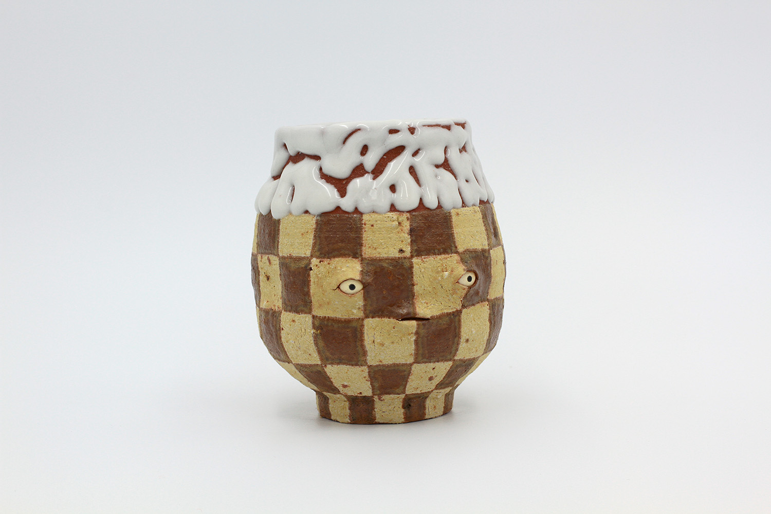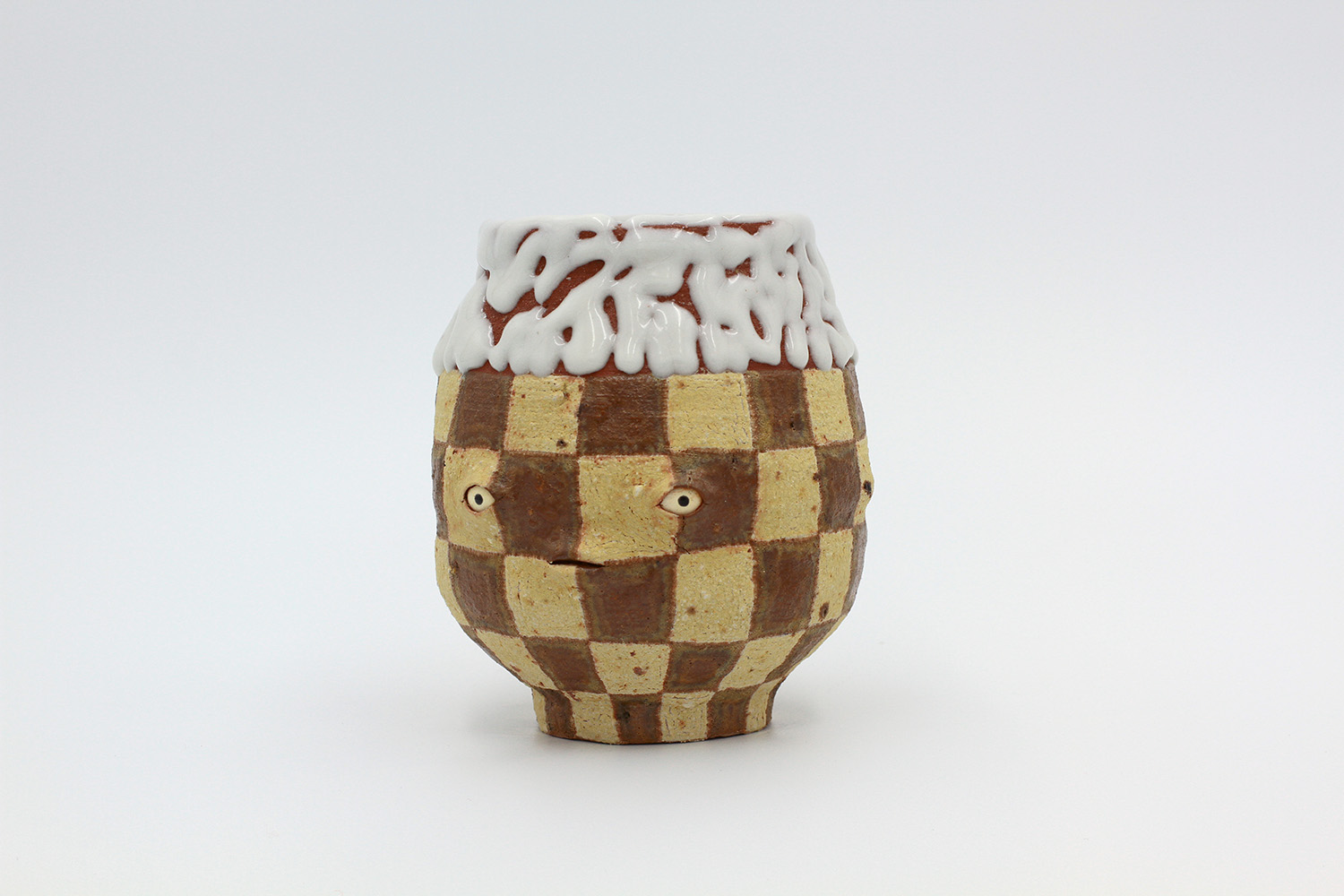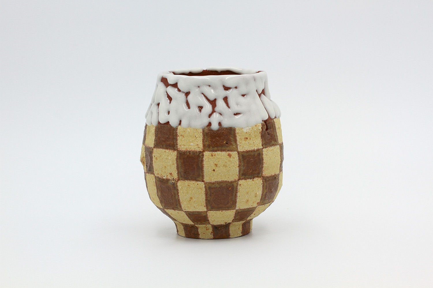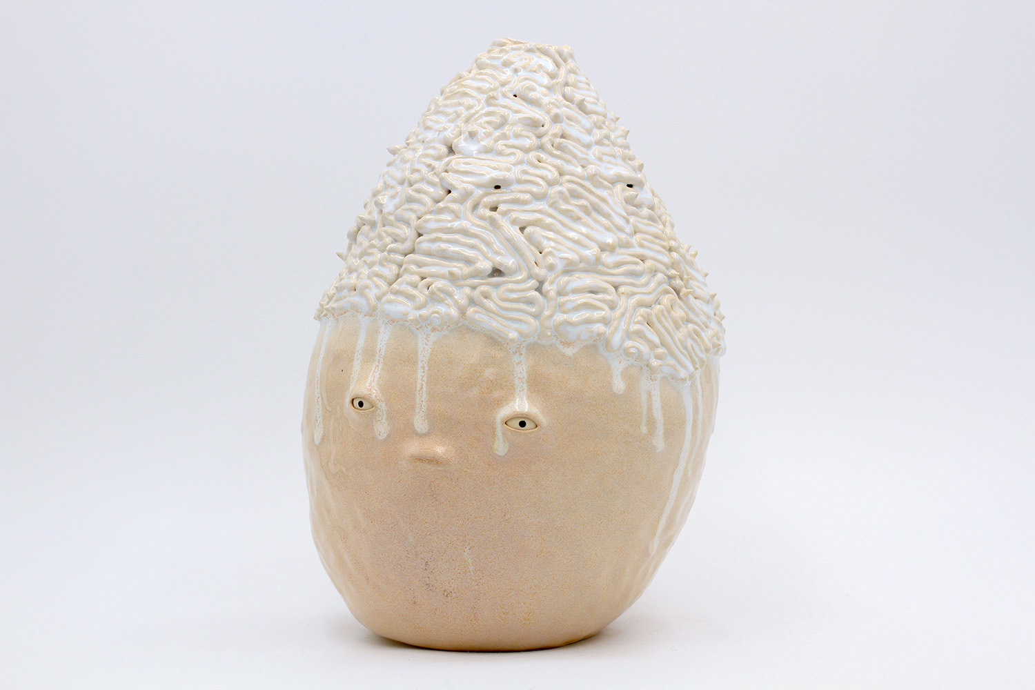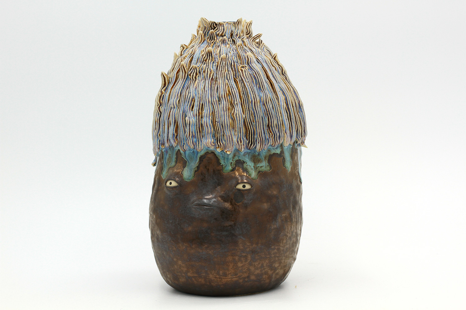 i am an ornamental vase with a rough textured body and drippy milky glaze. |