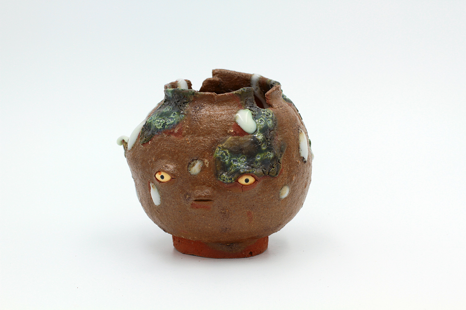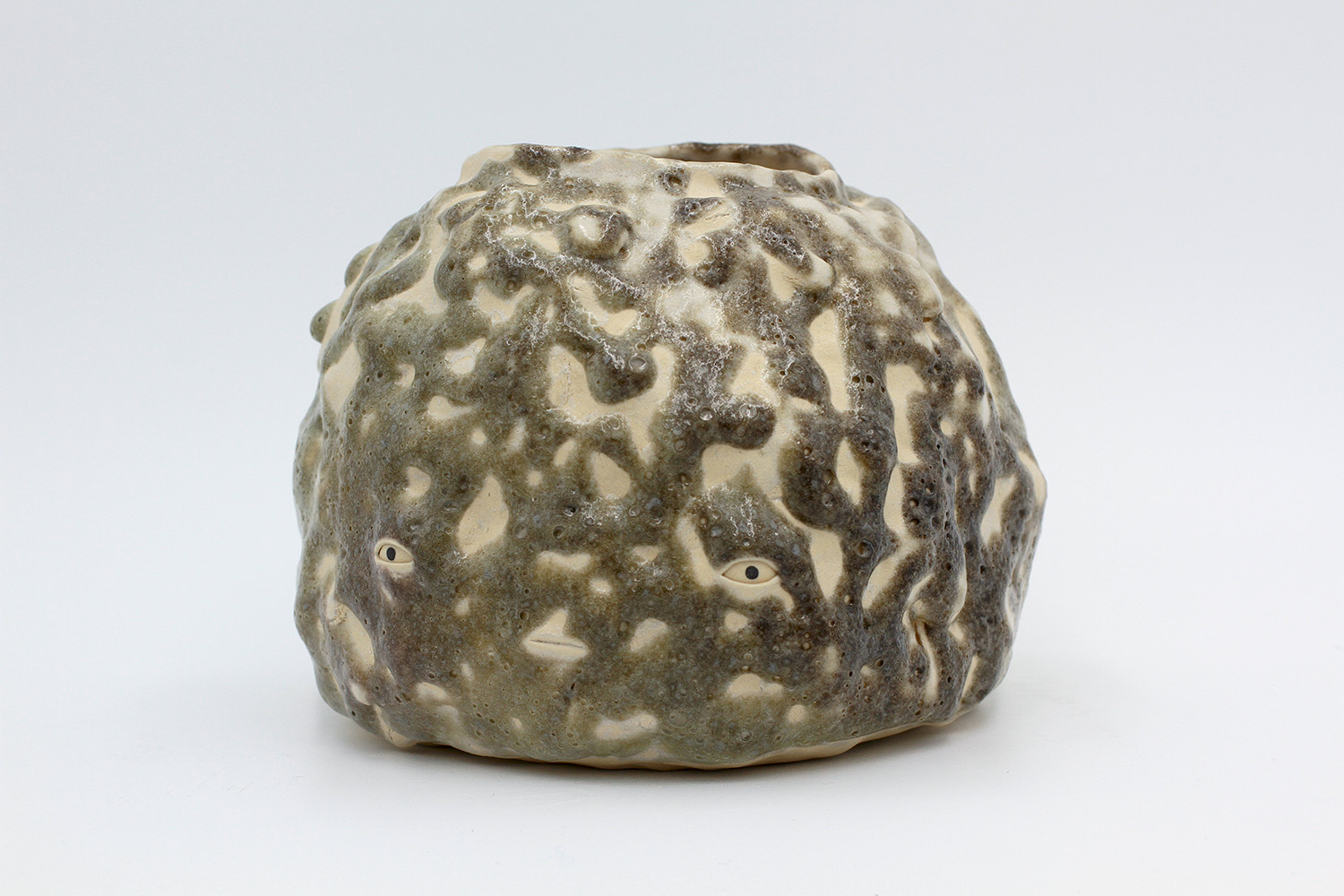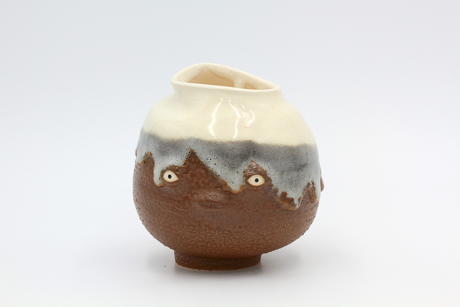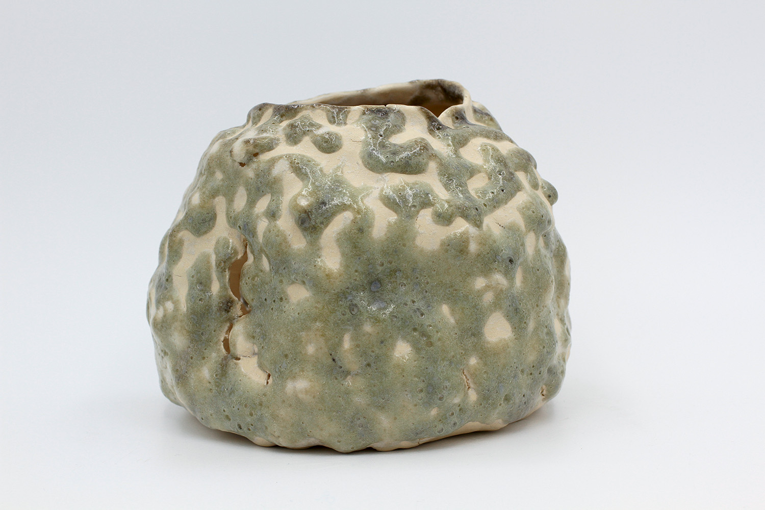 i'm a sculptural pot with bits of crackly lumpy glaze all over me. the cracks in me are intentional. |