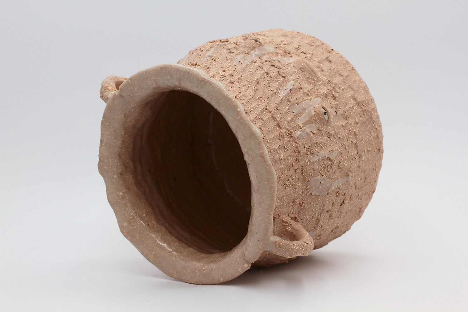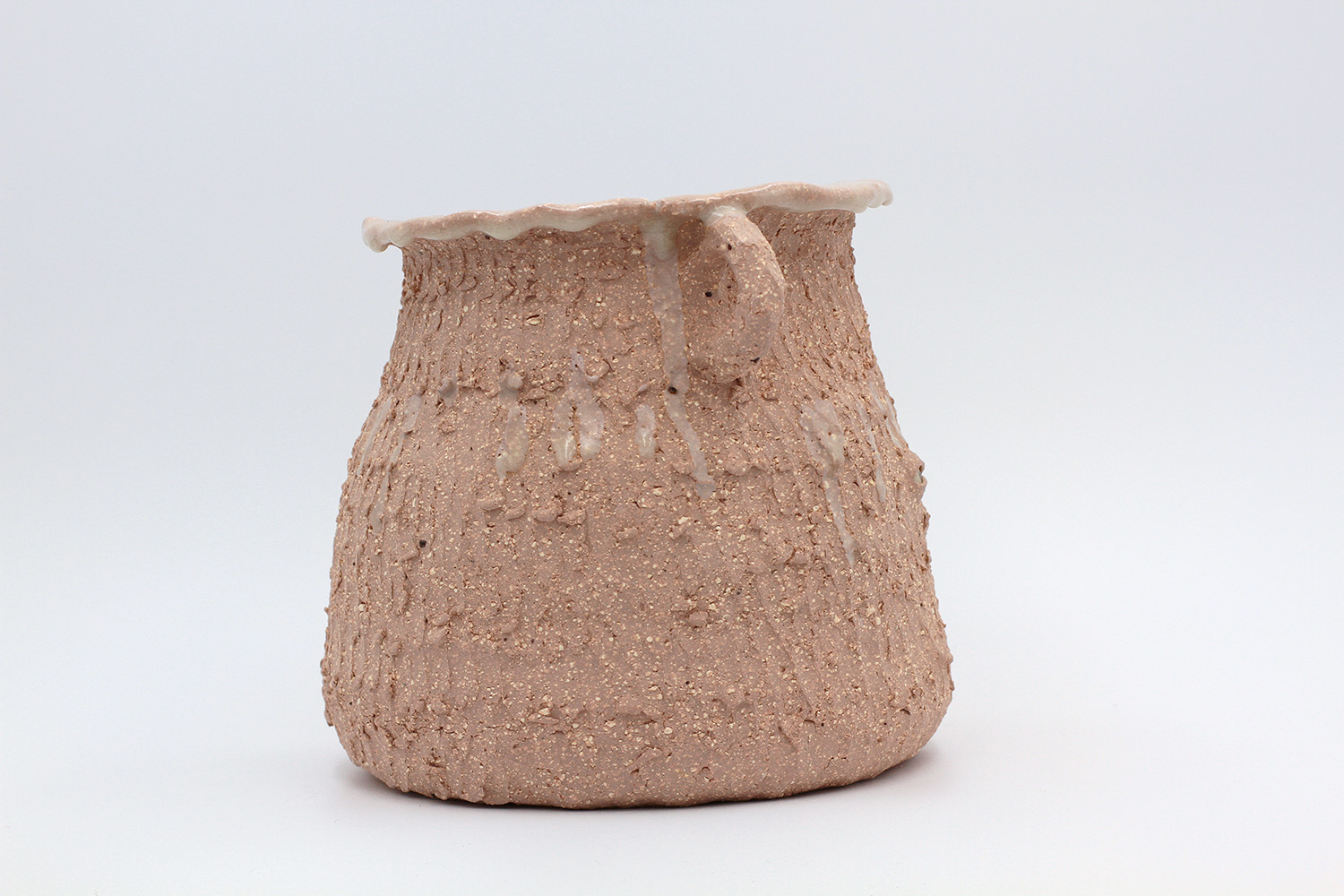 i am a pot with a rough texture on the outside and a thick milky glaze on the inside. |