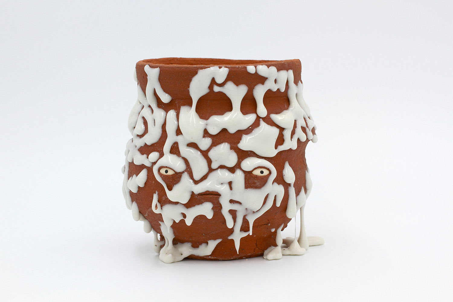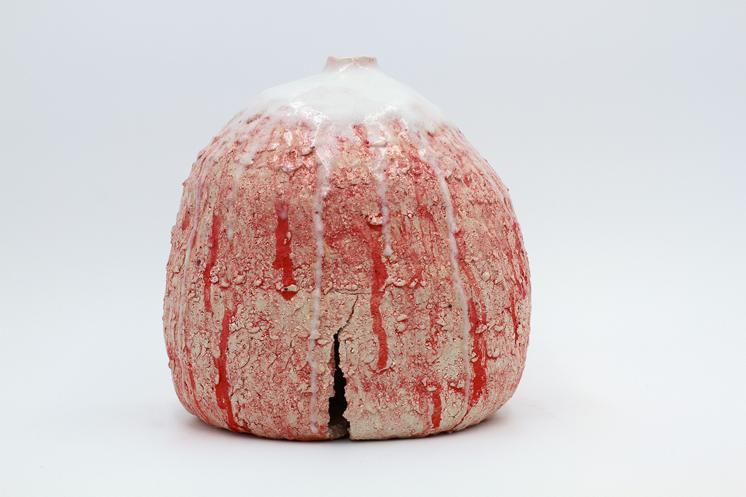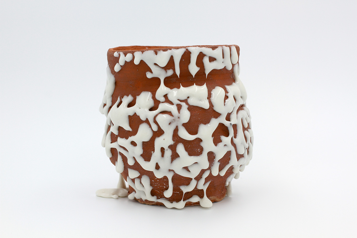 i am an ornamental vessel made from terracotta clay sourced from a building site in brunswick. my red gloopy glaze fell off in drips during firing. |